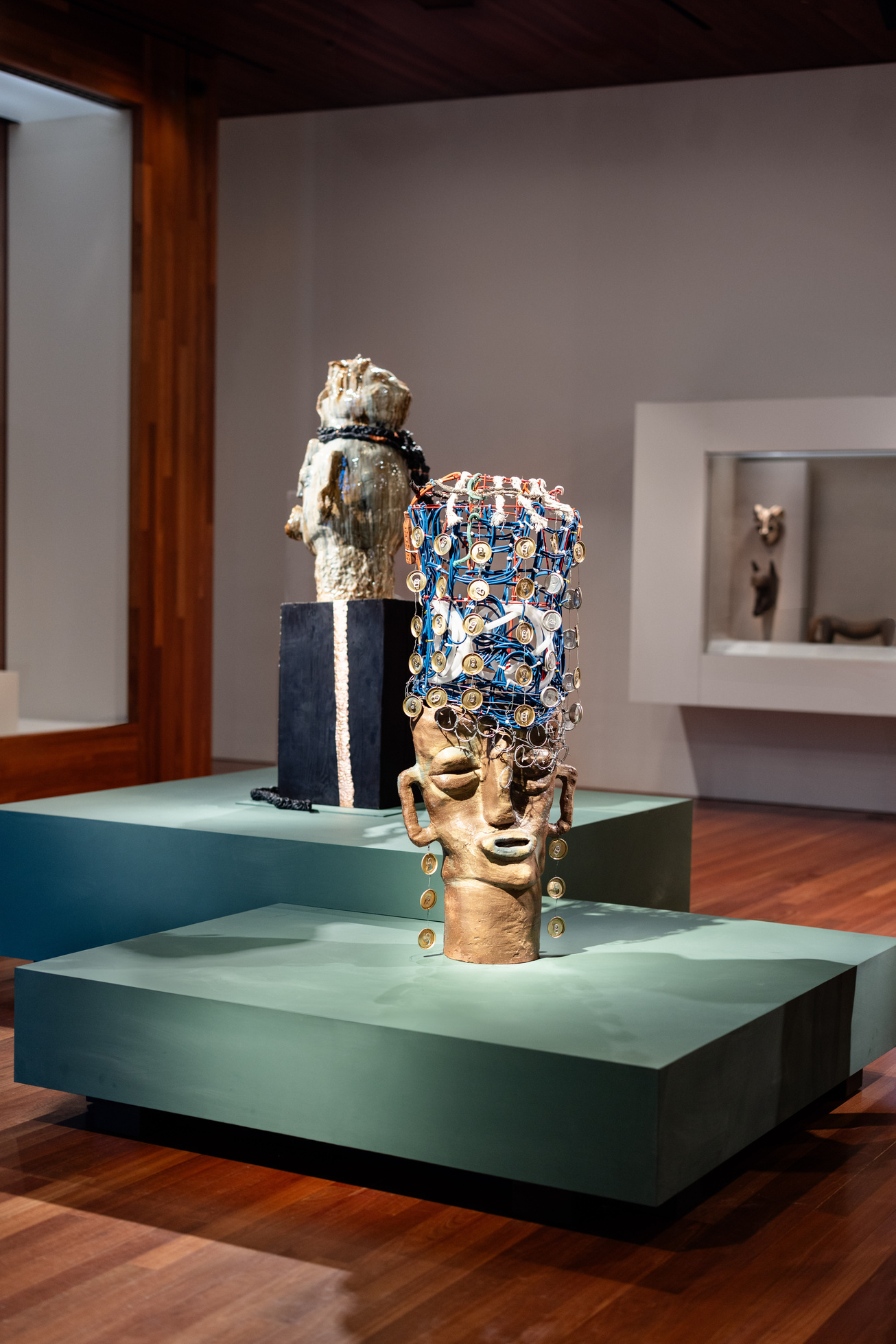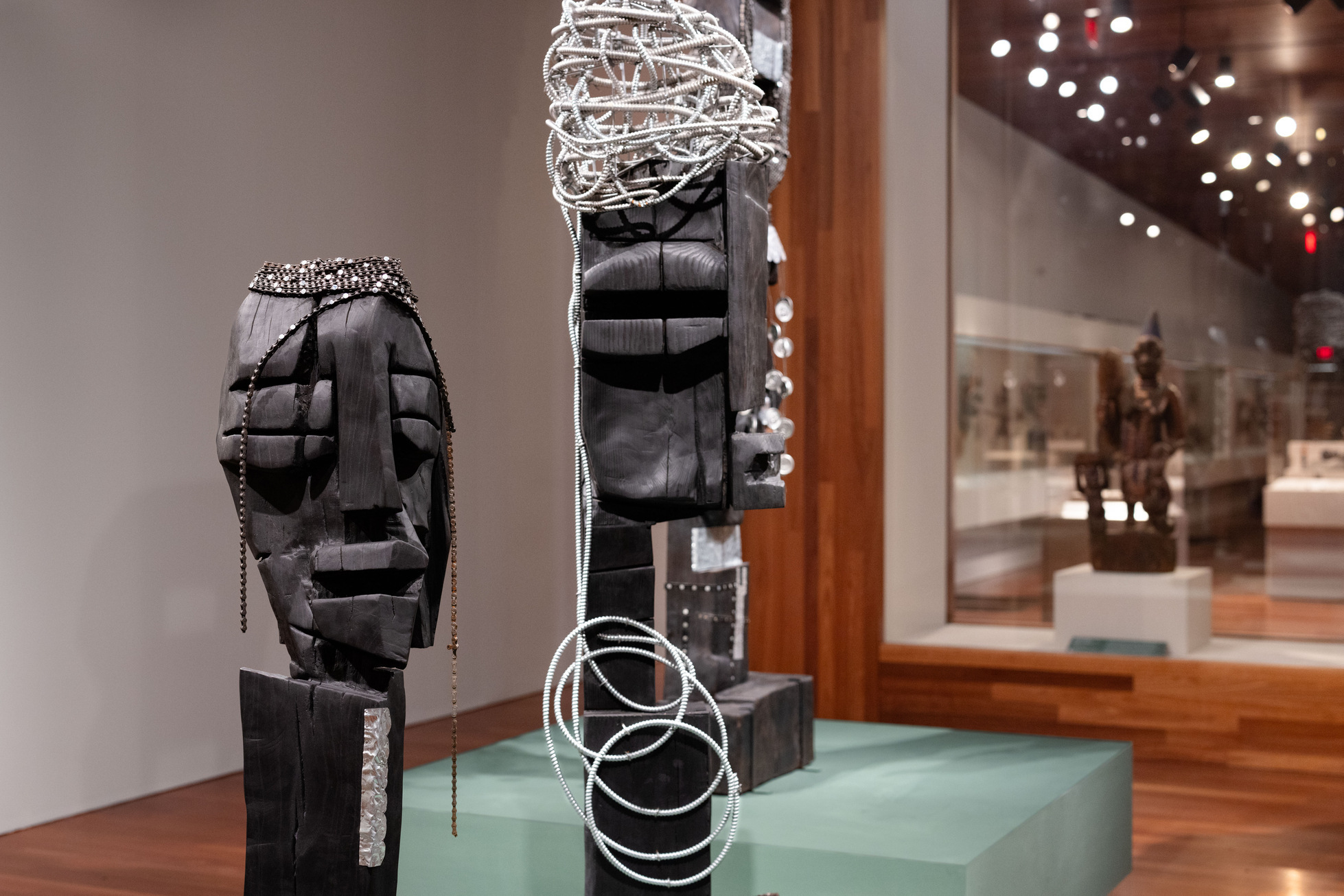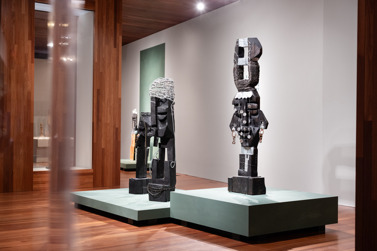 Installation view of “Leilah Babirye: We Have a History,” de Young Museum, San Francisco, Calif., 2024. Shown, from left, LEILAH BABIRYE, “Prince Ggamotoka from the Kuchu Royal Family of Buganda,” 2021; and LEILAH BABIRYE, “Nakalyango from the Kuchu Ngo (Leopard) Clan,” 2024. | Photo by Gary Sexton, Courtesy de Young Museum