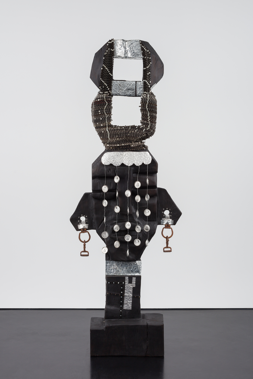 LEILAH BABIRYE, “Omugole Omukyala Namirembe Kaddulubale (Peaceful Bride of Mwanga II),” 2020 (wood, wax, nails, wire, glue and found objects, 96 1/8 x 36 5/8 x 11 3/4 inches / 244.16 x 93.03 x 29.84 cm). | Collection of Steve Corkin & Dan Maddalena. Photo by Mark Blower. Courtesy the artist, Stephen Friedman Gallery, London and New York and Gordon Robichaux, New York