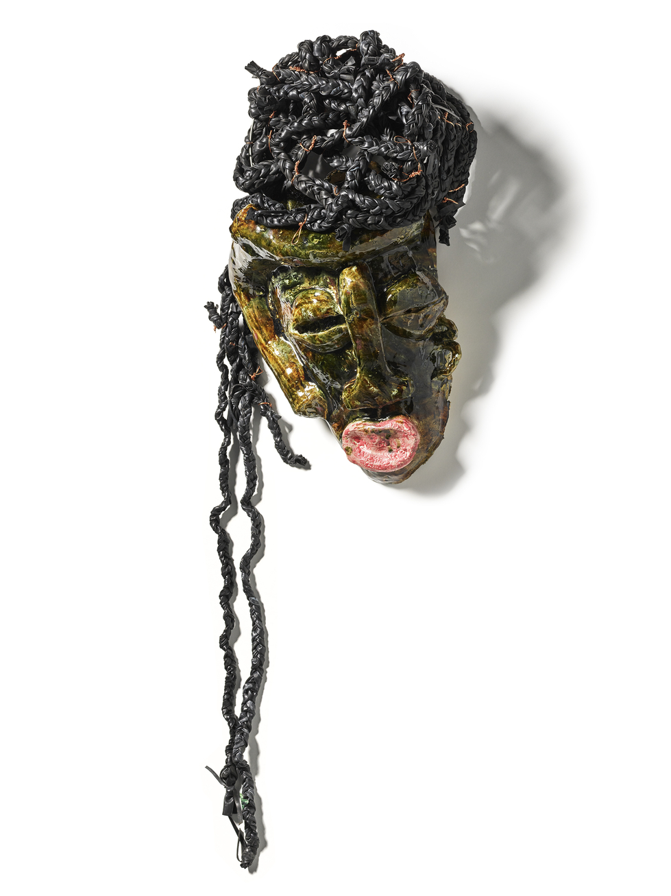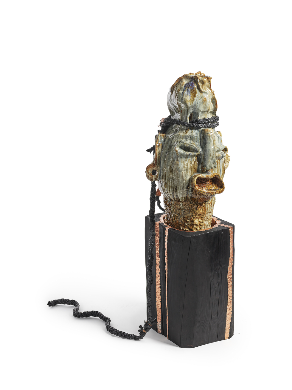 LEILAH BABIRYE, “Katiiti Kalibbala from the Nsenene (Grasshopper) Clan,” 2024 (ceramic, bicycle tyre inner tubes, and copper wire, 36 H x 22 L x 16 W inches (braid descends 52 inches from the top). | Courtesy the artist, Stephen Friedman Gallery, London and New York, and Gordon Robichaux, New York. Photo by Randy Dodson, Courtesy Fine Arts Museums of San Francisco