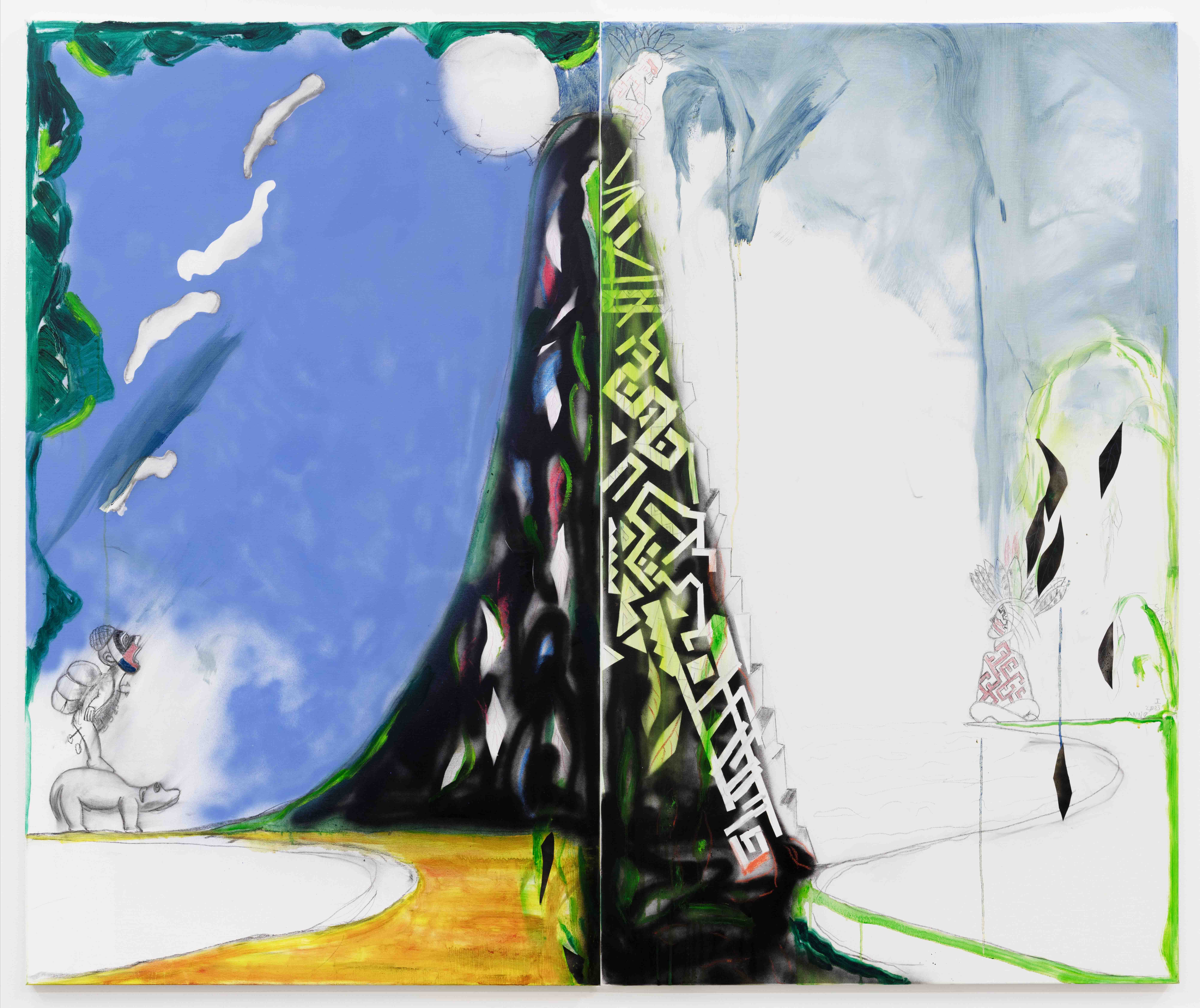 GEORGE NELSON PRESTON, “From the Ayahuasca Notebook: The Conquest of Futility: A Kongo Nganga Stills the Boulder of Sisyphous While Pajé Txai Kuin Climbs Jacob’s Ladder Only to Meet His Own Soul,” 2023 (Oil, acrylic, charcoal, and paper collage on canvas in two parts; 60 x 72 inches / 152.4 x 182.9 cm, overall; 60 x 36 inches / 152.4 x 91.4 cm, each). | © George Nelson Preston, Courtesy the artist and RYAN LEE Gallery, New York