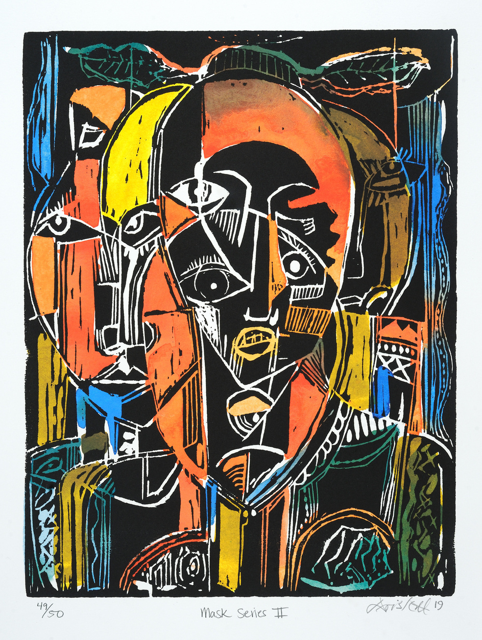 DAVID C. DRISKELL, “Mask Series II,” 2019 (relief woodcut, 14.50 x 11 inches. | Gift of Raven Fine Art Editions, 2019.10.002, Photo by Greg Staley, 2019