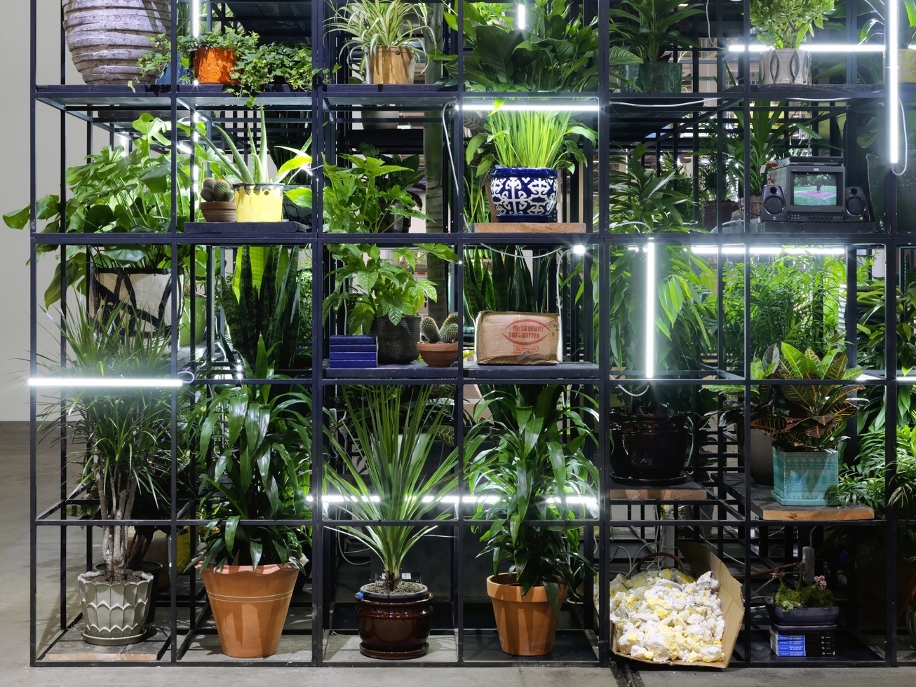 RASHID JOHNSON, Detail of “Antoine’s Organ,” 2016 (steel, grow lights, plants, wood, shea butter, books, monitors, rugs, and piano, 189 × 338 × 126 3/4 inches / 480.1 × 858.5 × 322 cm). | Image courtesy the artist © Rashid Johnson, 2024. Photo by Stefan Altenburger