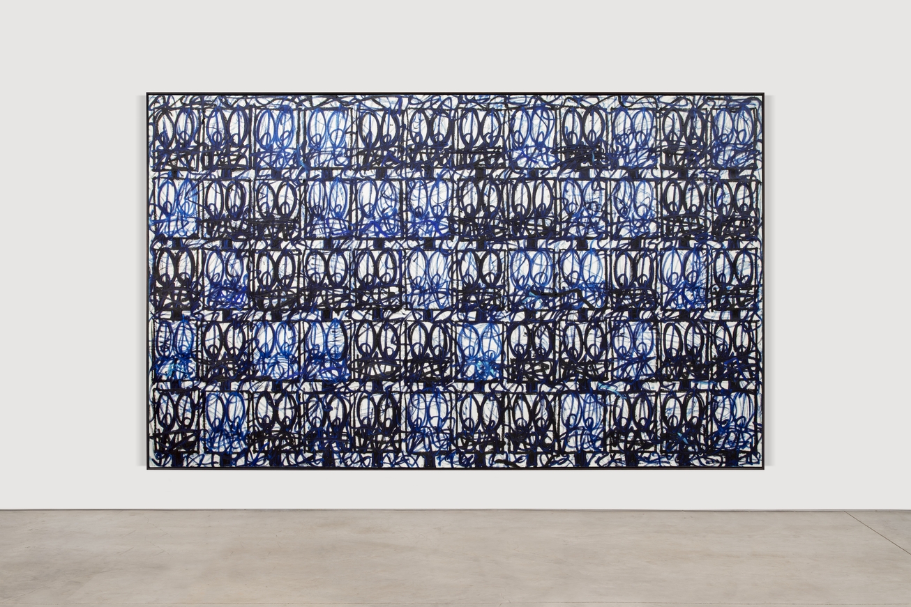 RASHID JOHNSON, “Bruise Painting ‘It’s All Over Now, Baby Blue,’” 2021 (oil on linen, 95 7/8 × 157 3/4 × 2 1/2 inches / 243.5 × 400.7 × 6.4 cm). | Image courtesy the artist © Rashid Johnson, 2024. Photo by Stephanie Powell