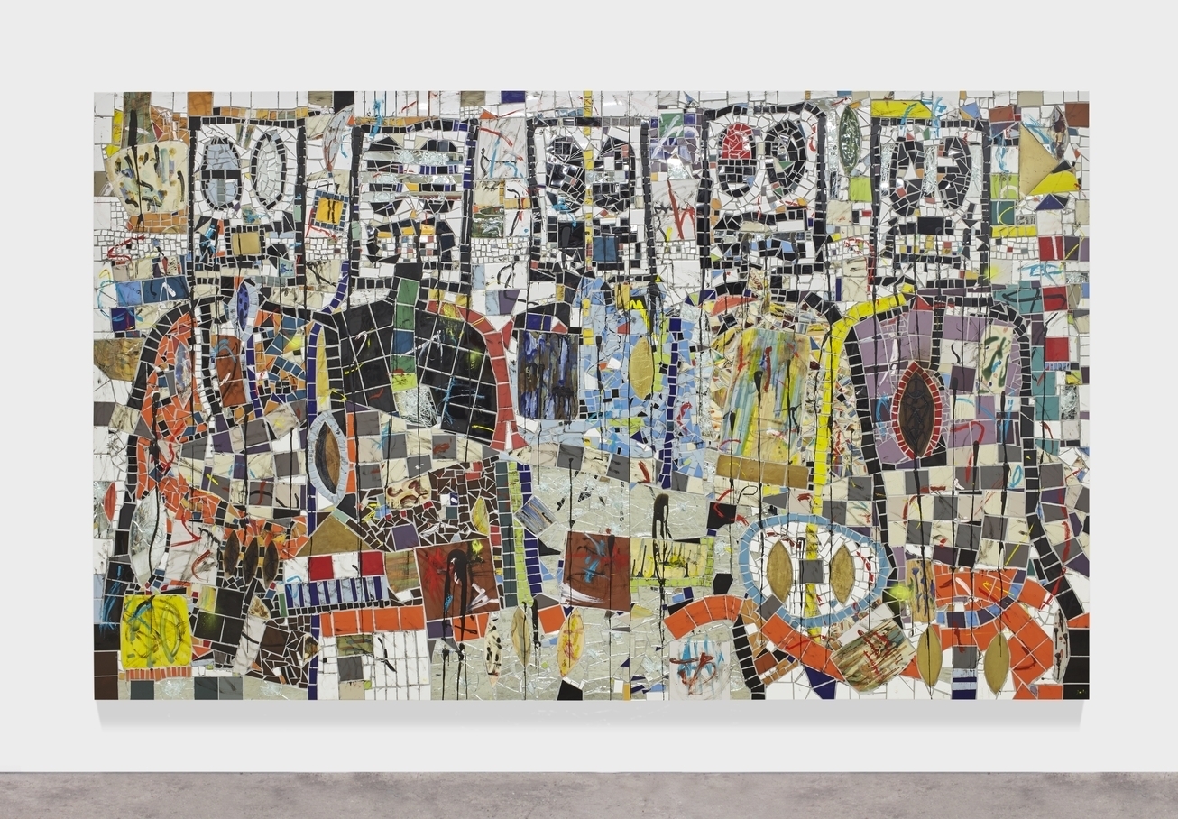 RASHID JOHNSON, “Untitled Escape Collage,” 2018 (ceramic tile, mirror tile, branded red oak flooring, vinyl, spray enamel, oil stick, black soap, and wax, 97 × 121 × 2 1/4 inches / 246.4 × 307.3 × 5.7 cm). | Image courtesy the artist © Rashid Johnson, 2024. Photo by Martin Parsekian