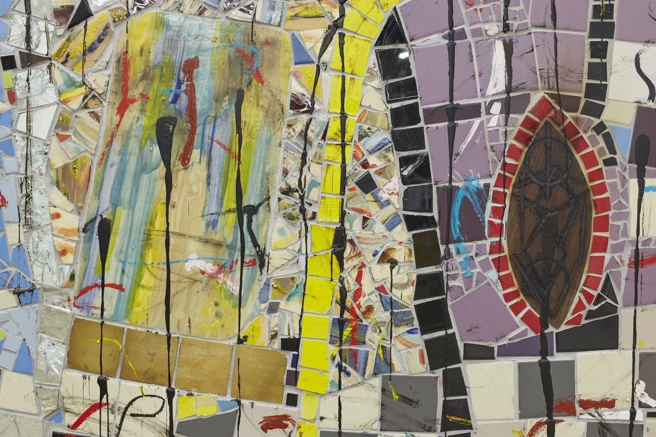 RASHID JOHNSON, Detail of “The Broken Five,” 2019 (ceramic tile, mirror tile, branded red oak flooring, vinyl, spray enamel, oil stick, black soap, and wax, 97 1/4 × 156 1/2 × 2 1/8 inches / 247 × 397.5 × 5.4 cm). | Image courtesy the artist © Rashid Johnson, 2024. Photo by Martin Parsekian