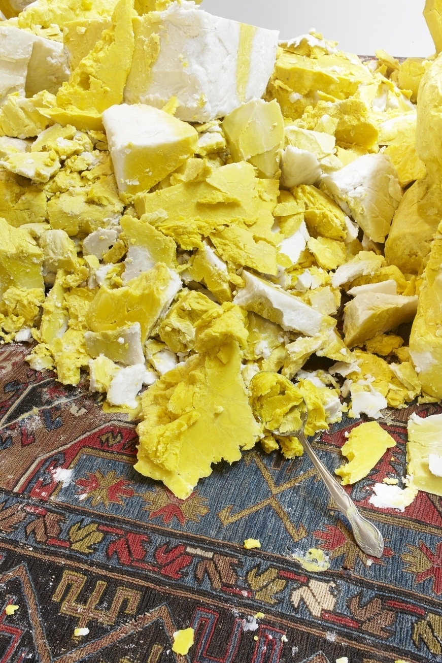 RASHID JOHNSON, “Untitled (Shea Butter Table),” 2016 (shea butter, Persian rug, and branded walnut, 55 × 203 × 72 1/2 inches / 139.7 × 515.6 × 184.2 cm). | Image courtesy the artist © Rashid Johnson, 2024. Photo by Martin Parsekian