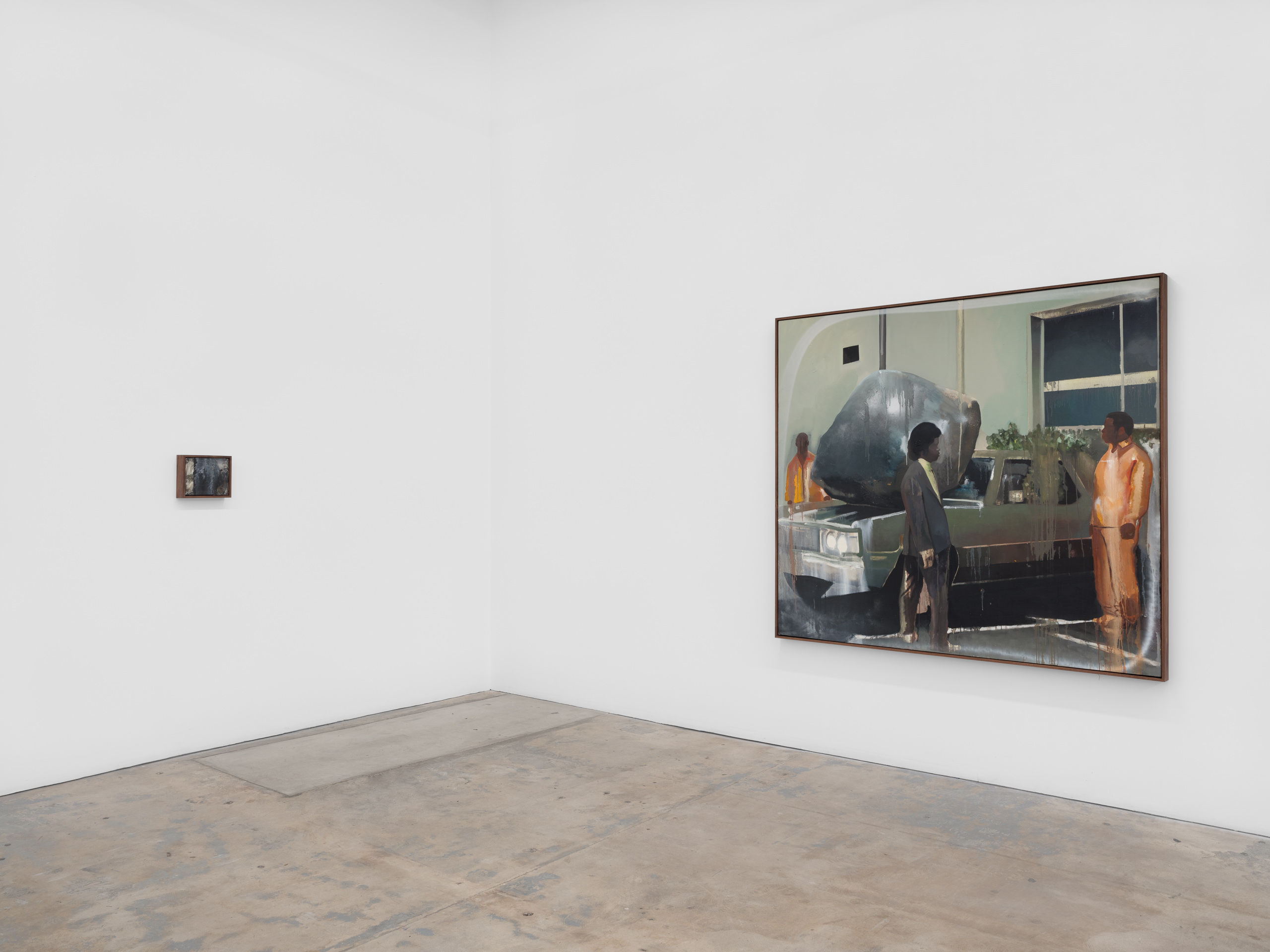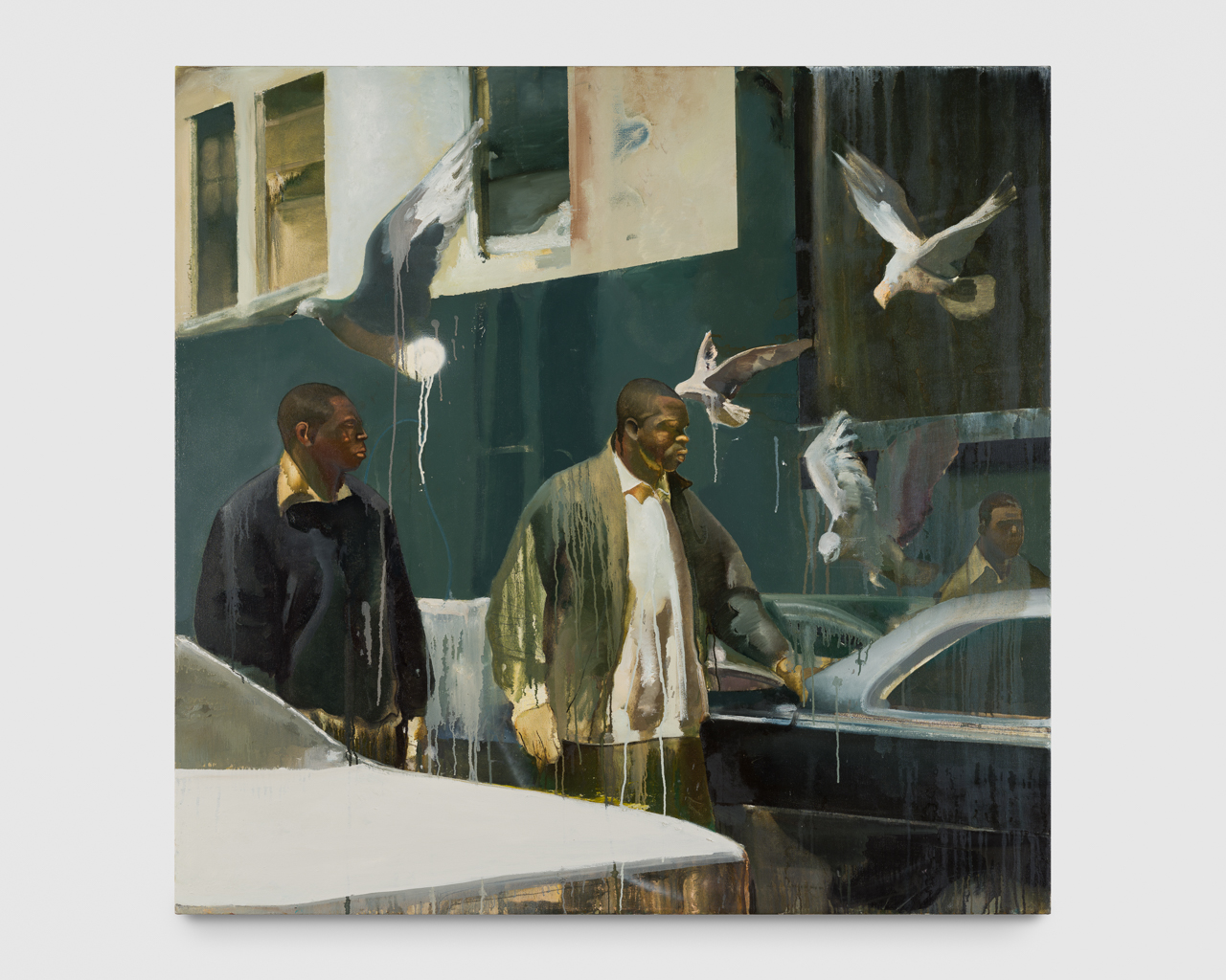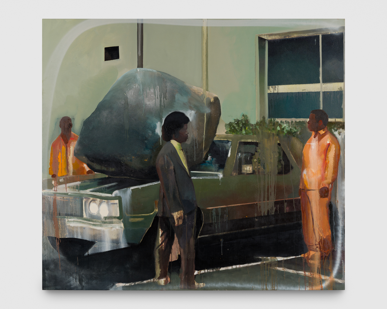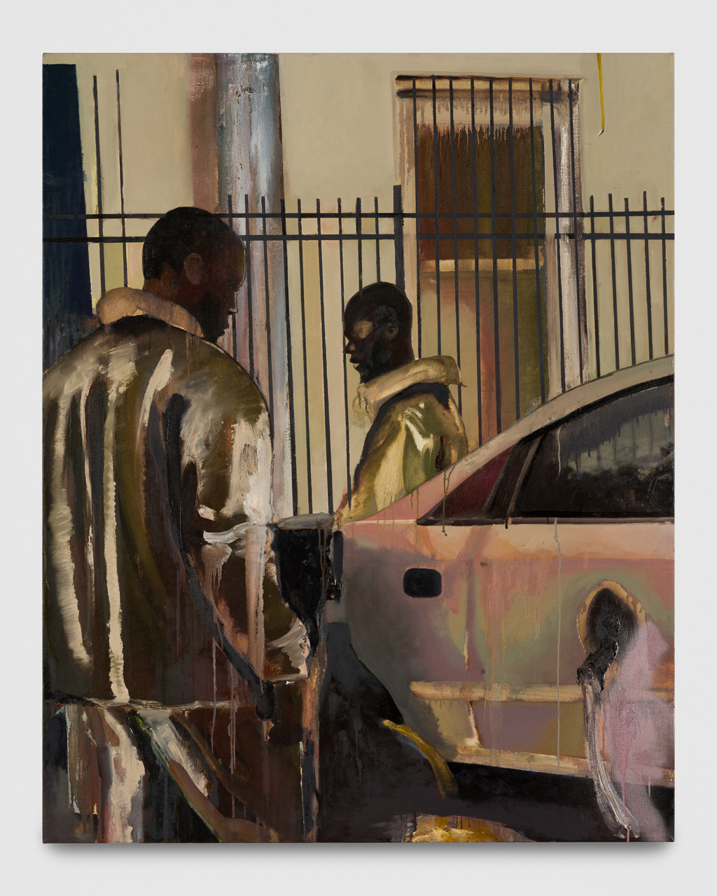 The figurative scenes feature male subjects, classic cars, urban architecture, and saturated tones. The images at once possess an alluring beauty, old-school character, and element of mystery. Johnson has introduced areas of abstraction; interventions such as a large boulder crushing the hood of a car and unnerving, low-flying birds; and dripping paint evincing a transitional state, as if his figures and objects are melting or washing away, all of which shift the spirit of the scenes. Extraordinary depictions of otherwise ordinary moments, the paintings convey a liminal sense of time, space, and existence.