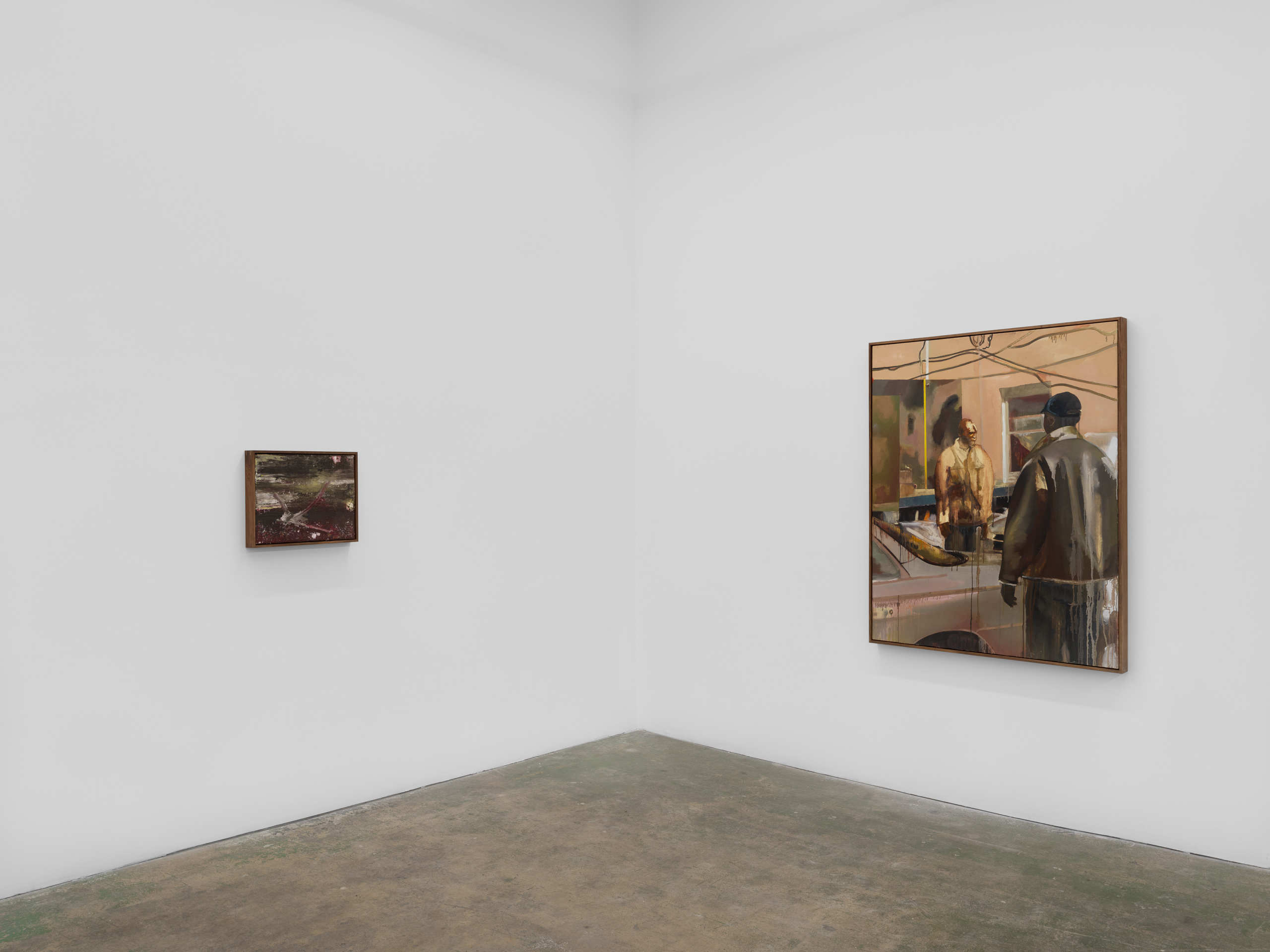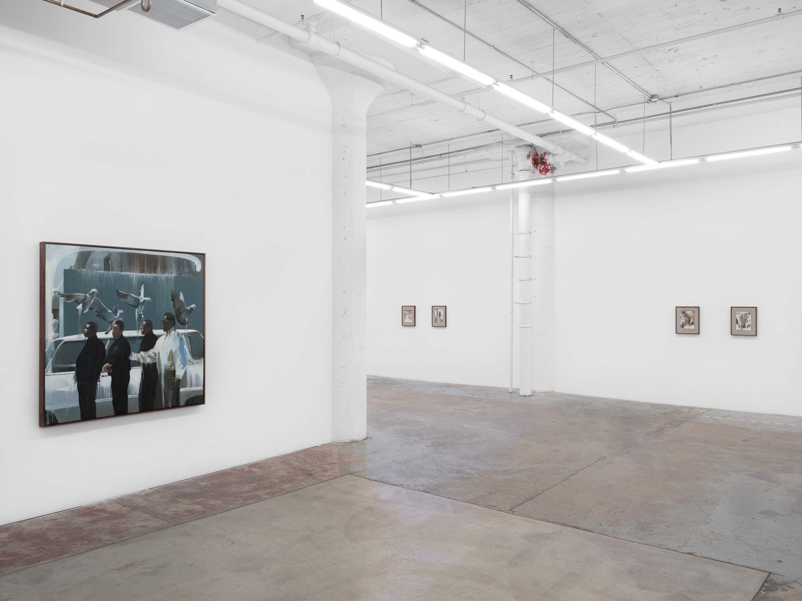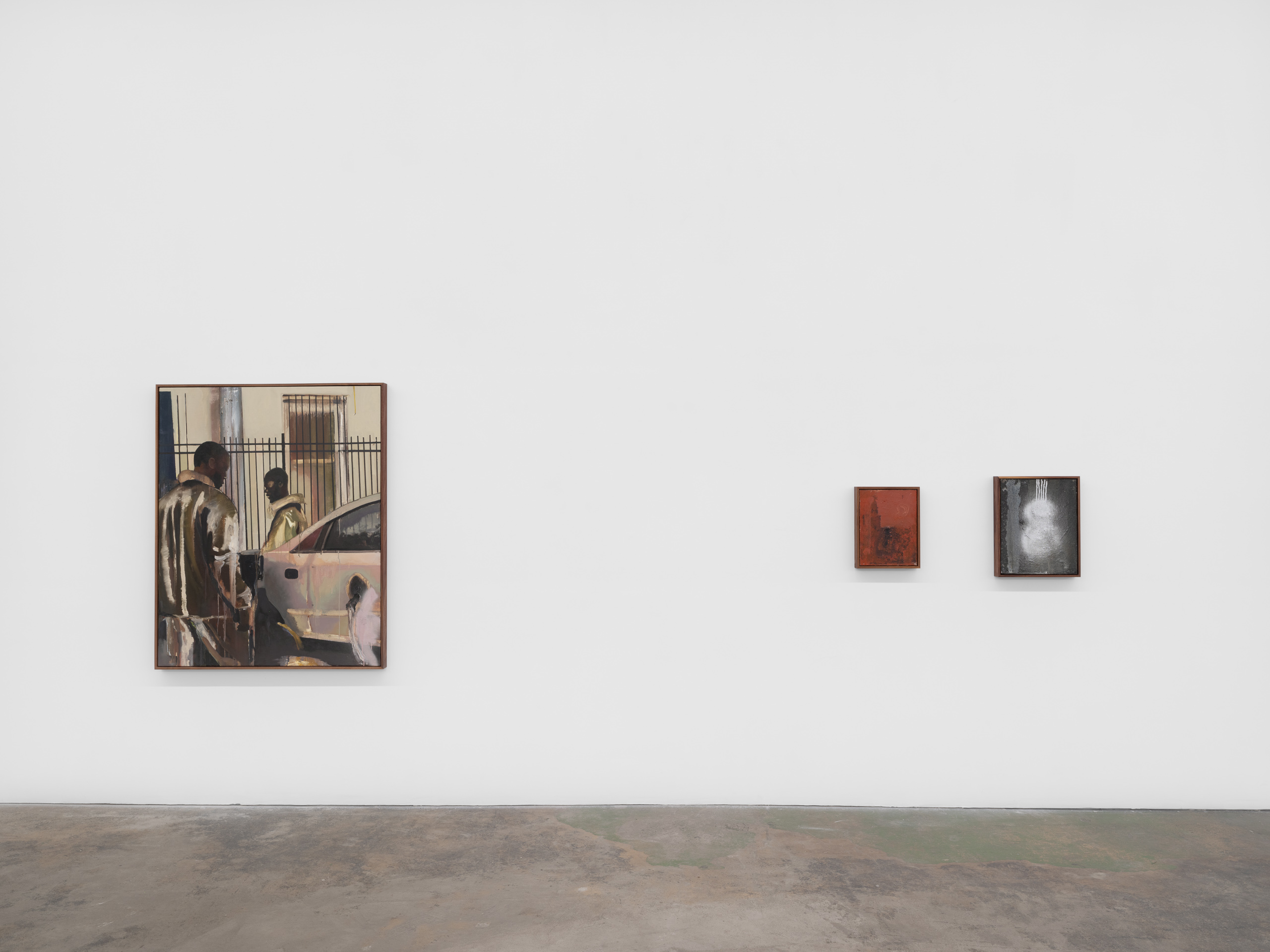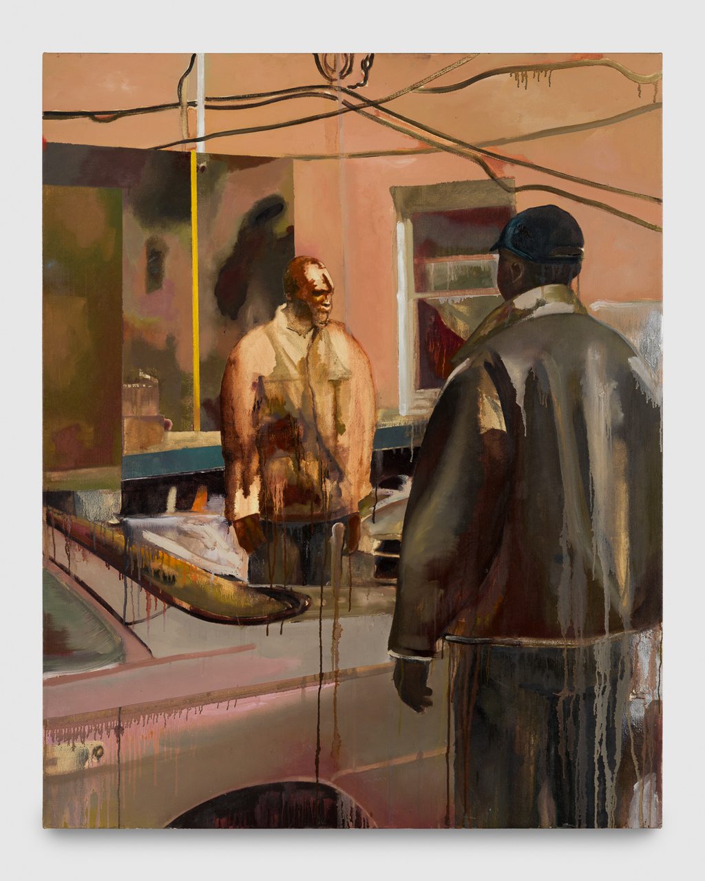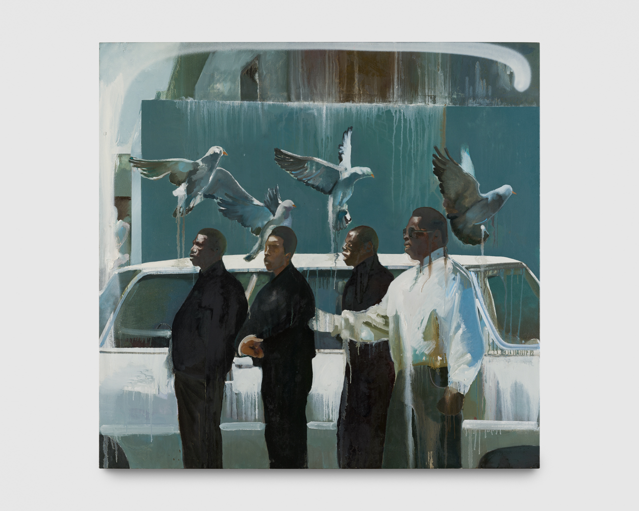 The figurative scenes feature male subjects, classic cars, urban architecture, and saturated tones. The images at once possess an alluring beauty, old-school character, and element of mystery. Johnson has introduced areas of abstraction; interventions such as a large boulder crushing the hood of a car and unnerving, low-flying birds; and dripping paint evincing a transitional state, as if his figures and objects are melting or washing away, all of which shift the spirit of the scenes. Extraordinary depictions of otherwise ordinary moments, the paintings convey a liminal sense of time, space, and existence.