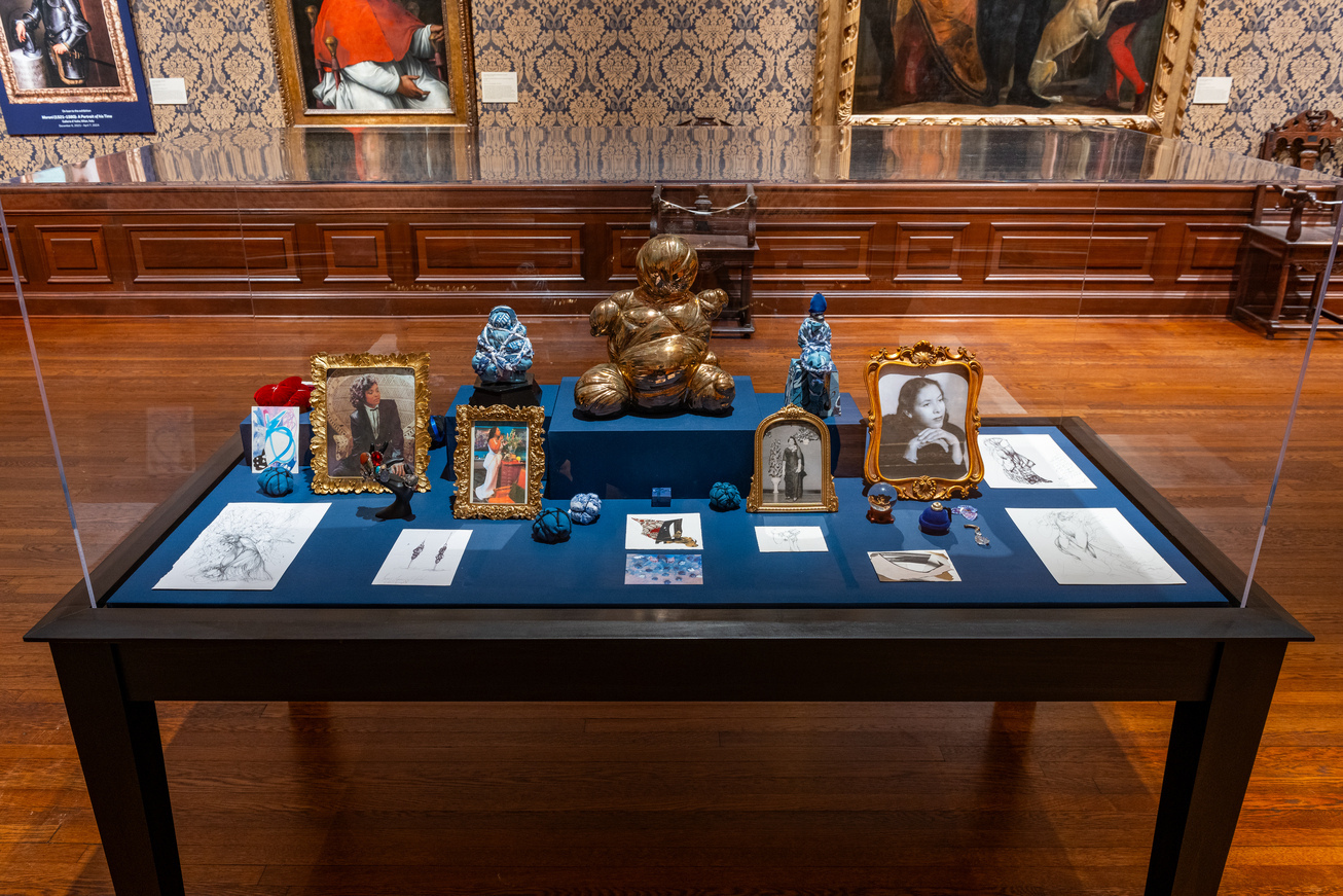 A display featuring small sculptures and framed photos of Shinique Smith’s family juxtaposed with works by Old Masters in the background. | Courtesy Ringling Museum of Art