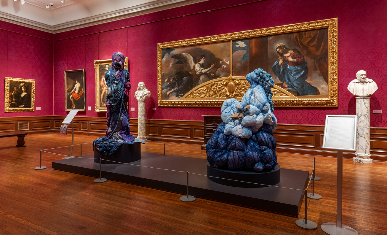 “Grace Stands Beside” and “Stargazer” by Shinique Smith installed in front of Guercino’s Annunciation in Gallery 8, The Ringling Museum of Art. | Courtesy Ringling Museum of Art