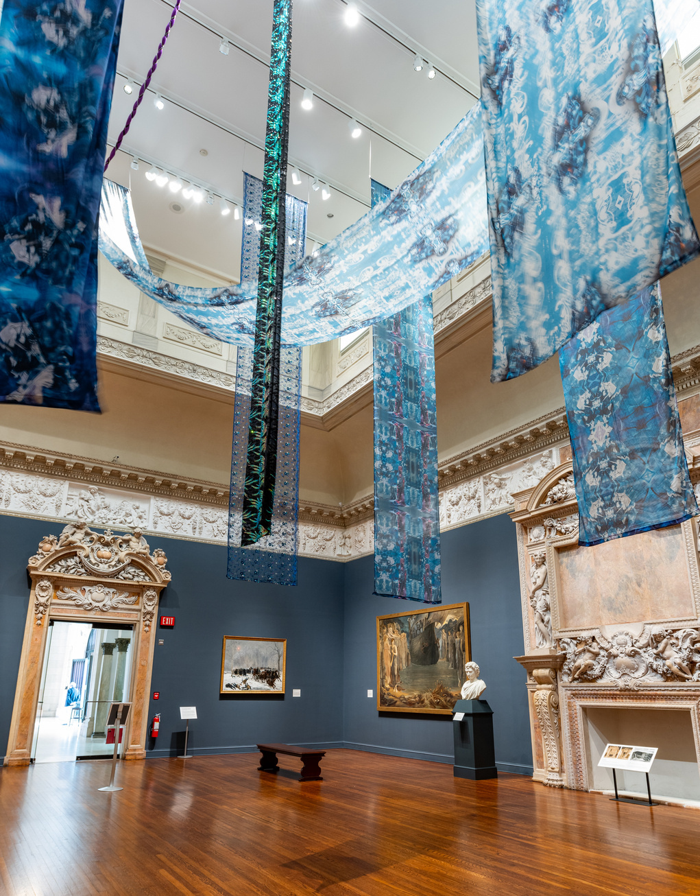 “Blue Unity (Ode to a Black Star)” by Shinique Smith installed in gallery 21 as “a visualized poem performed in the air.” The work was inspired by Alice Ruth Clark Brown (1952–2021), the first African American woman to work as a dancer, elephant rider and aerial acrobat with the Ringling Brothers Circus. | Courtesy Ringling Museum of Art