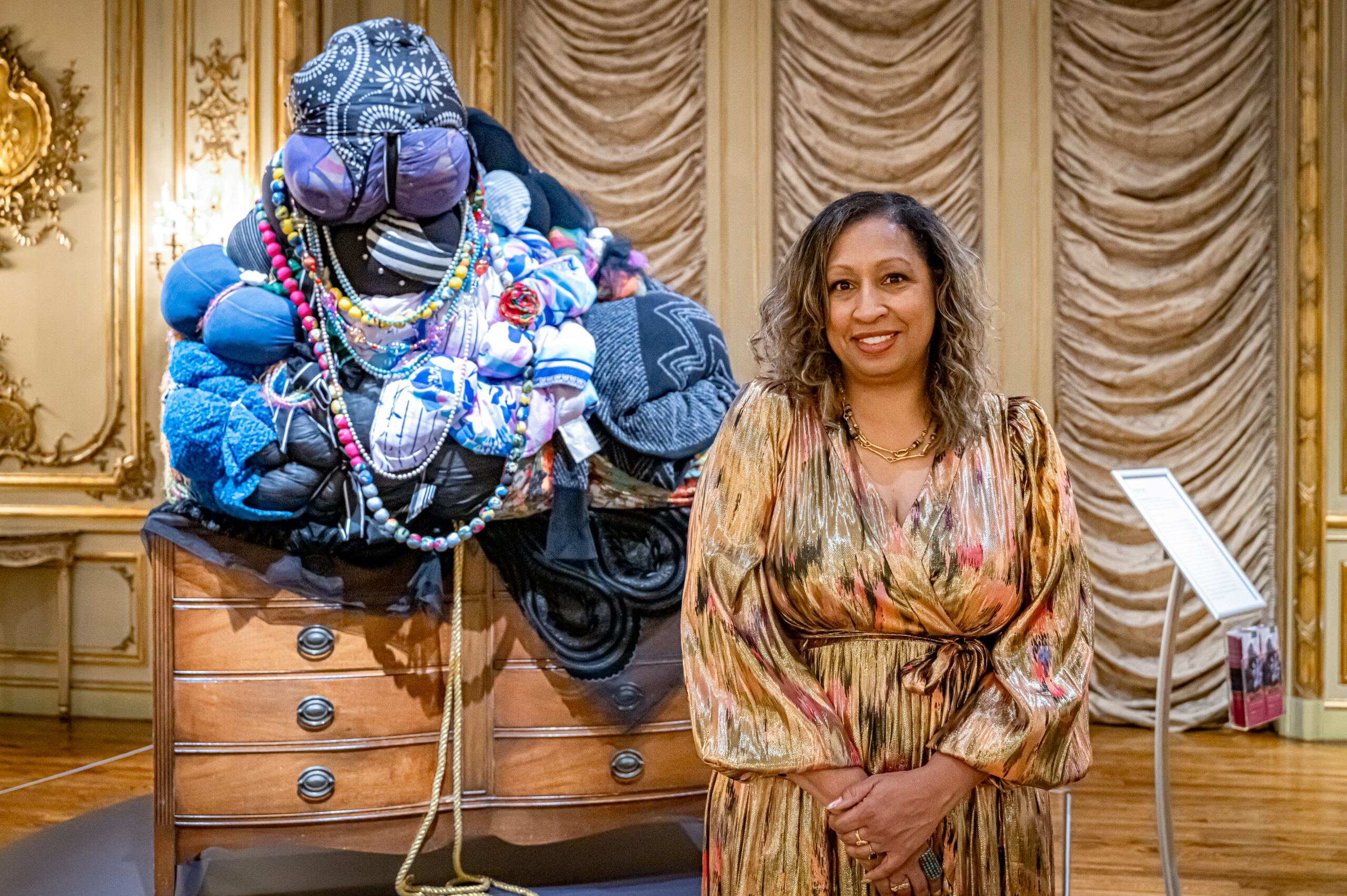Artist Shinique Smith standing in front of her sculpture Mitumba Deity II (2018-2023) on display in the Astor Salon (Gallery 19), which was relocated from the Astor Mansion in New York City to the museum in 1926. The room is an extremely rare surviving example of intact Gilded Age room decoration. | Courtesy Ringling Museum of Art