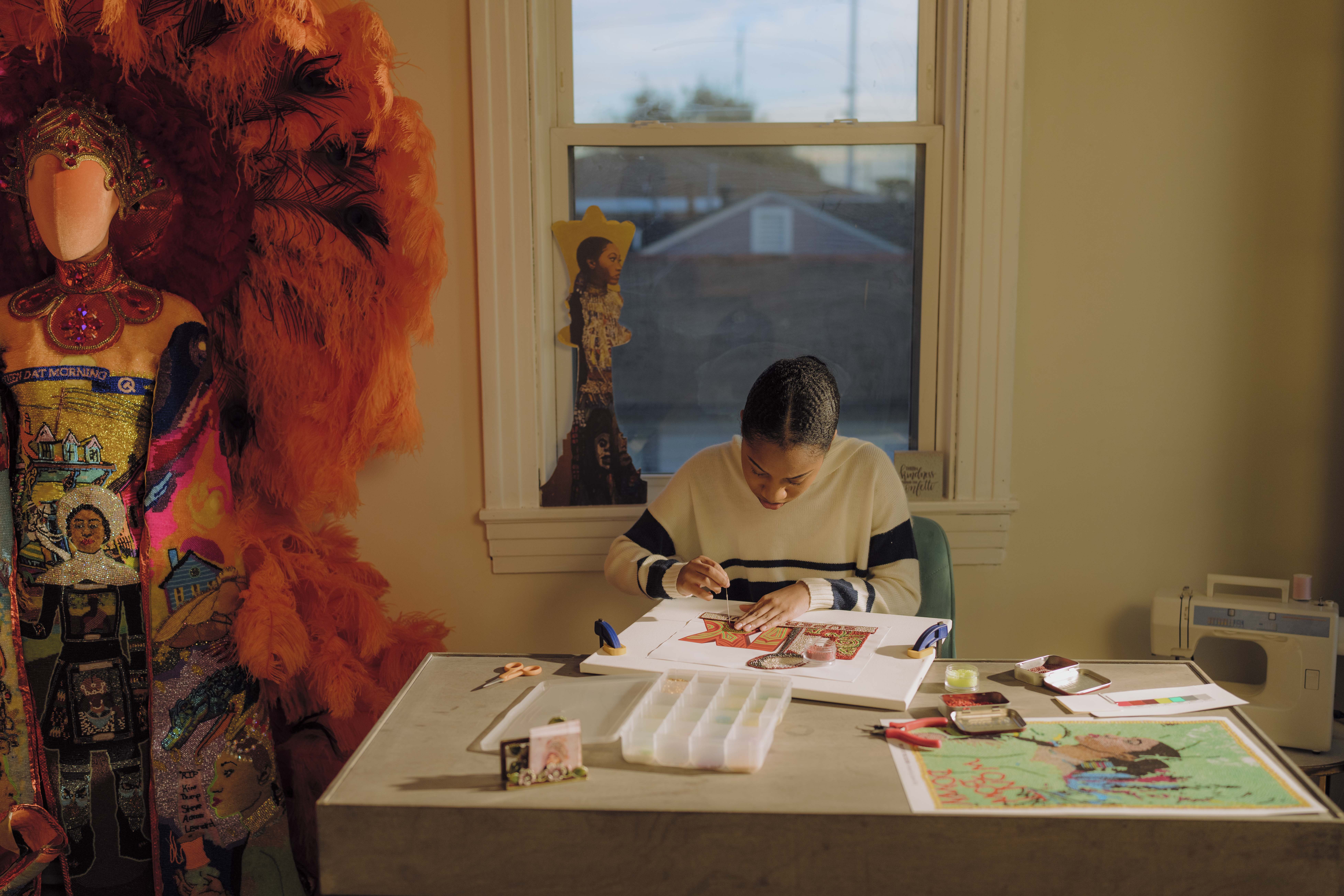 Queen Tahj working on the Super Bowl logo in her studio. The New Orleans artist is known for her intricate, hand-sewn beadwork. | Courtesy NFL