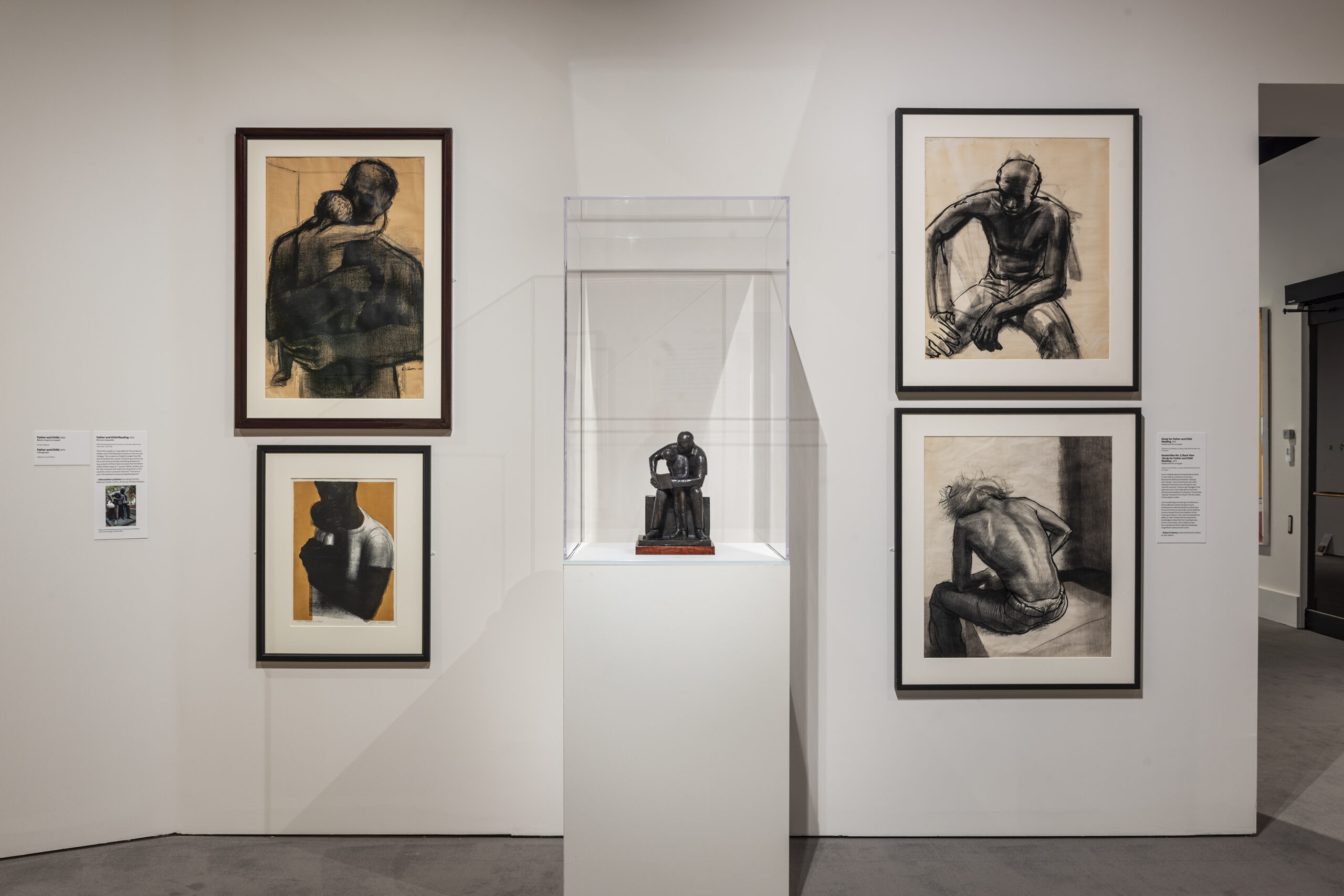 Installation view of “Witnessing Humanity: The Art of John Wilson,” Museum of Fine Arts, Boston, Lois B. and Michael K. Torf Gallery (Feb. 8-June 22, 2025). Shown in foreground, Maquette for “Eternal Presence,” modeled 1985, cast 1998 (bronze, 101.6 × 76.2 × 94 cm / 40 × 30 × 37 inches), Cast by Paul King Foundry. | Photograph © Museum of Fine Arts, Boston