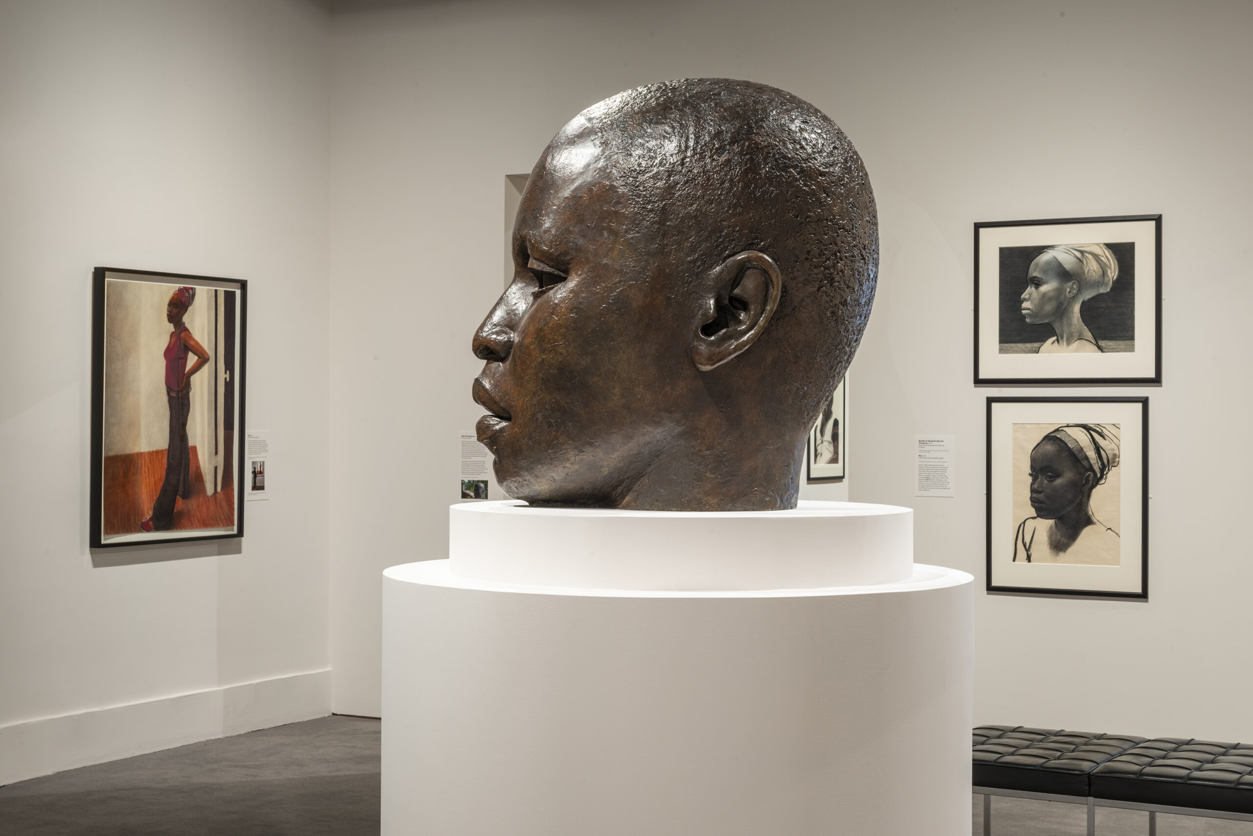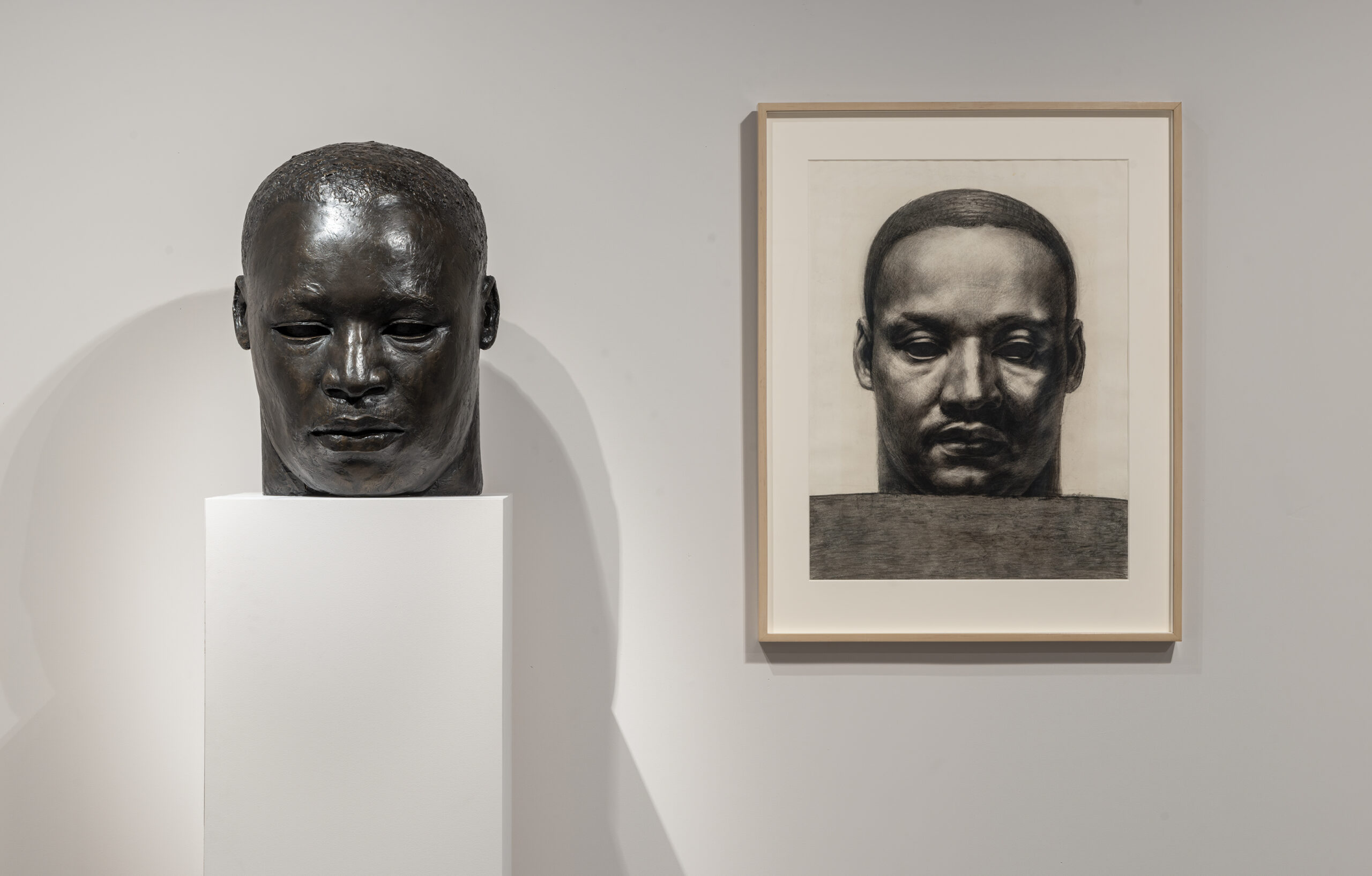 Installation view of “Witnessing Humanity: The Art of John Wilson,” Museum of Fine Arts, Boston, Lois B. and Michael K. Torf Gallery (Feb. 8-June 22, 2025). Shown, from left, “Martin Luther King, Jr.” (Buffalo maquette), 1982 (bronze, Overall: 76.2 × 58.4 × 58.4 cm / 30 × 23 × 23 inches), Collection of Julia Wilson; “Martin Luther King, Jr.,” 1981 (charcoal and charcoal pencil, with erasing and scratching out, on wove paper; Framed: 121.9 × 95.9 × 5.7 cm / 48 × 37 3/4 × 2 1/4 inches), Sheet: 96.8 × 74.8 cm / 38 1/8 × 29 7/16 inches), Philadelphia Museum of Art. | Photograph © Museum of Fine Arts, Boston