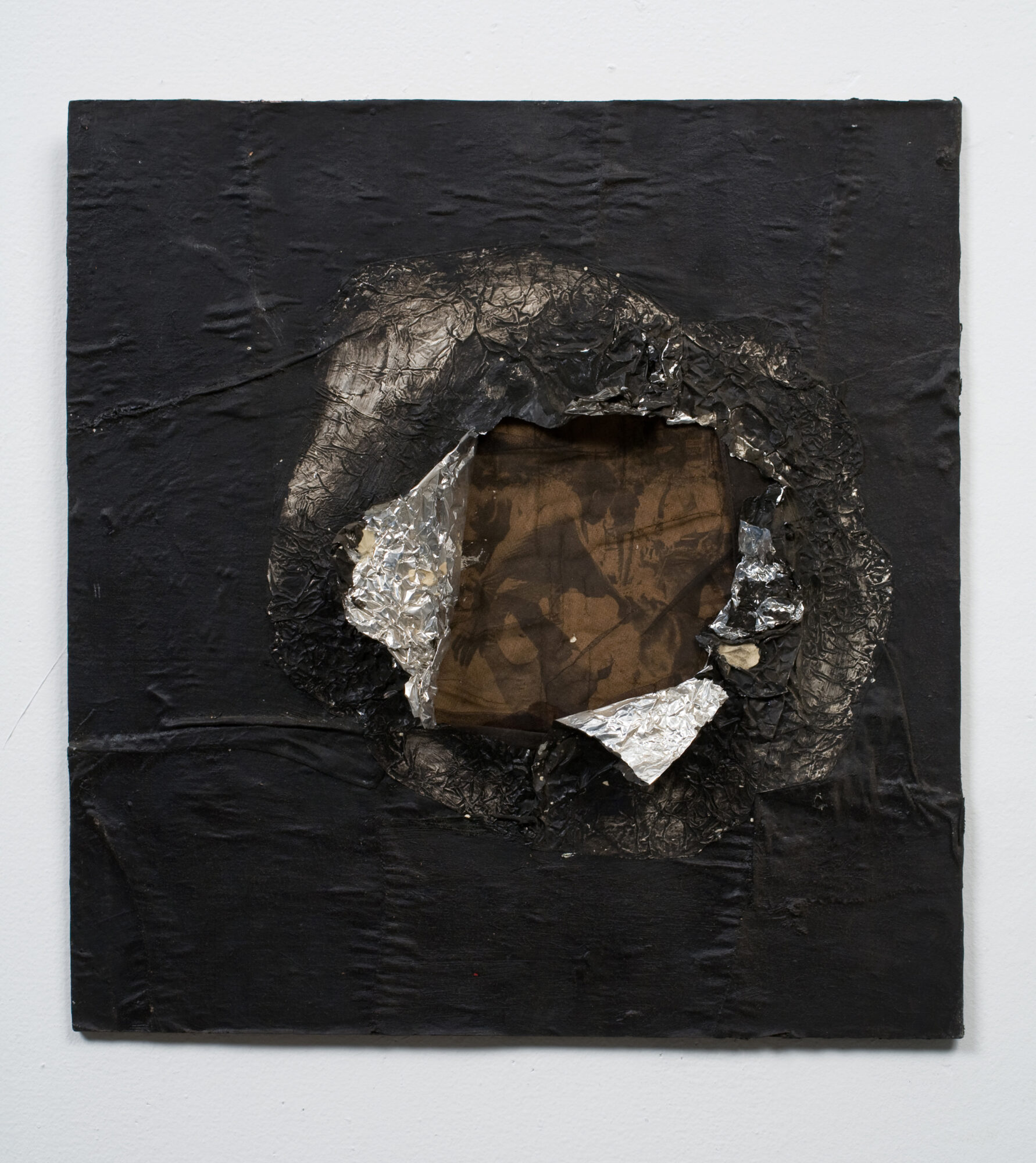JACK WHITTEN, “Birmingham 1964,” 1964 (aluminum foil, newsprint, stocking and oil on board, 16 5/8 x 16 inches / 42.2 x 40.6 cm). | Collection of Joel Wachs. © Photo by John Berens, Courtesy Jack Whitten Estate and Hauser & Wirth