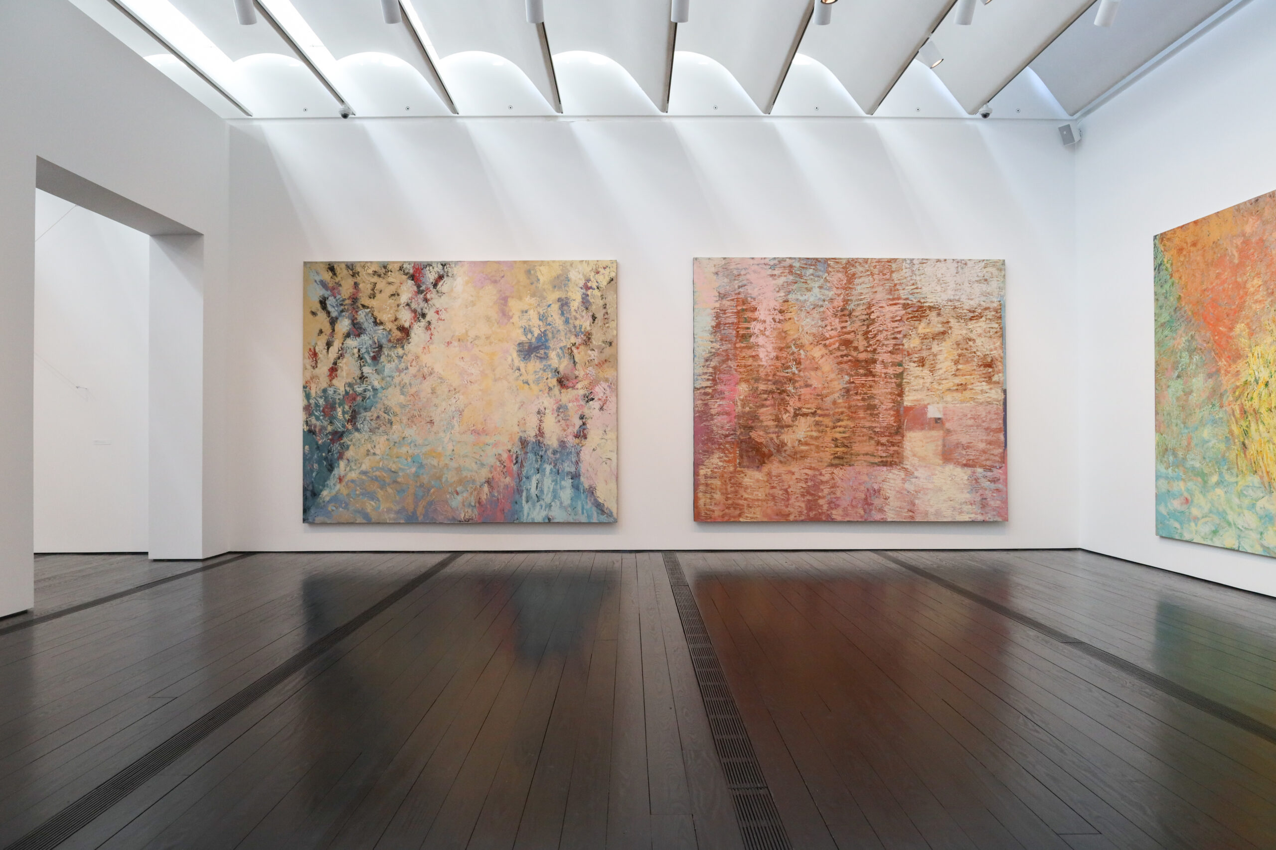 Installation view of “Joe Overstreet: Taking Flight,” The Menil Collection, Houston, Texas (Jan. 24-July 13, 2025). Shown, from left, “Baobab and Fish,” 1993 (oil and beeswax on canvas, 120 × 144 inches / 304.8 × 365.8 cm); “Kermel,” 1993 (oil and beeswax on canvas, 120 × 144 inches / 304.8 × 365.8 cm); “Exit Dust,” 1993 (oil and beeswax on canvas, 120 × 144 inches / 304.8 × 365.8 cm), © Estate of Joe Overstreet/Arst Rights Society (ARS), Courtesy of Eric Firestone Gallery, New York (3). | Courtesy The Menil Collection, Houston