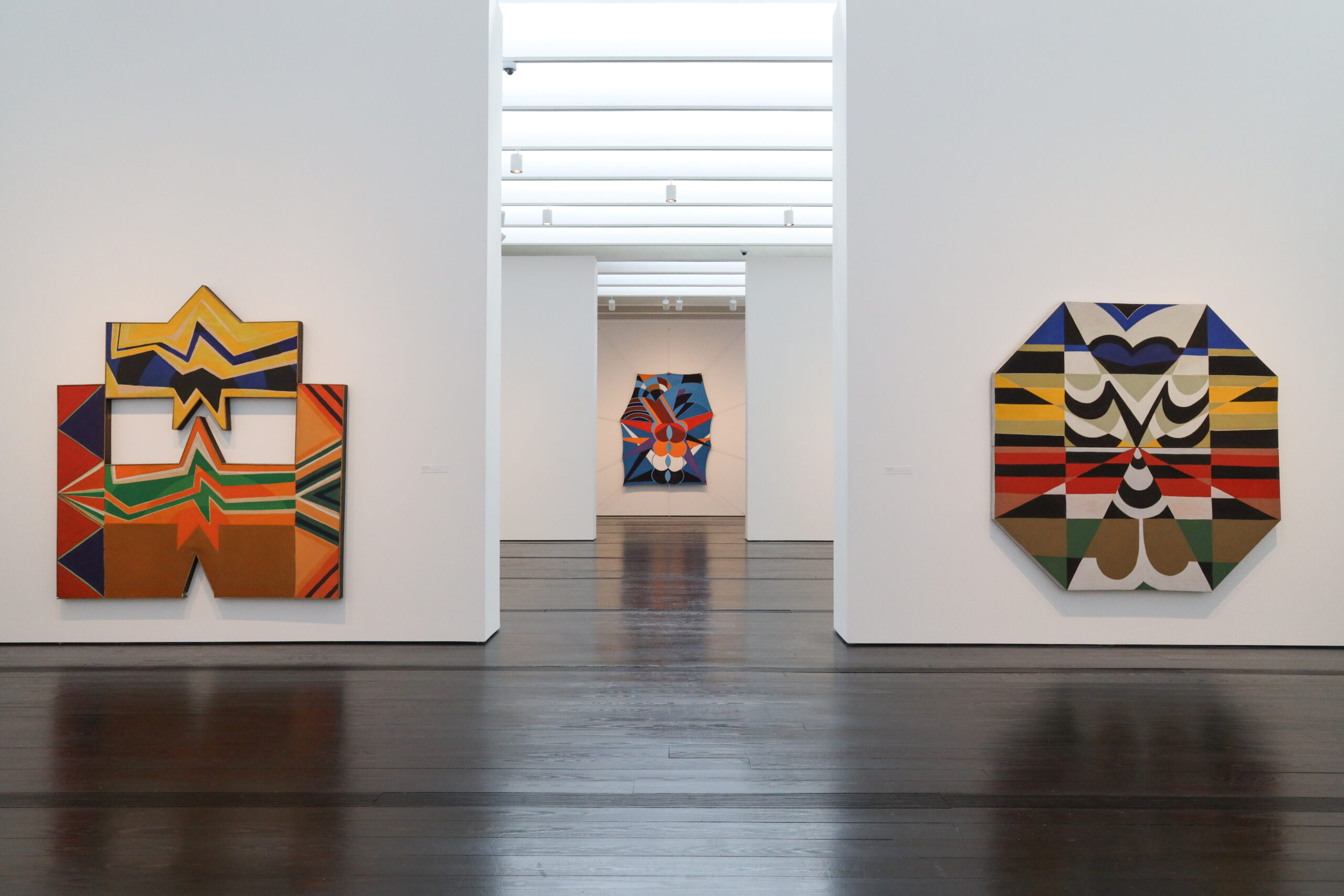 Installation view of “Joe Overstreet: Taking Flight,” The Menil Collection, Houston, Texas (Jan. 24-July 13, 2025). Shown, foreground, from left, “North Star,” 1968 (acrylic on shaped canvas, 93 1/2 × 85 5/8 × 3 inches / 237.5 × 217.5 × 7.6 cm); “Tribal Chieftain,” 1969 (acrylic on shaped canvas, 85 1/8 × 84 × 2 7/8 inches / 216.2 × 213.4 × 7.3 cm). | Courtesy The Menil Collection, Houston