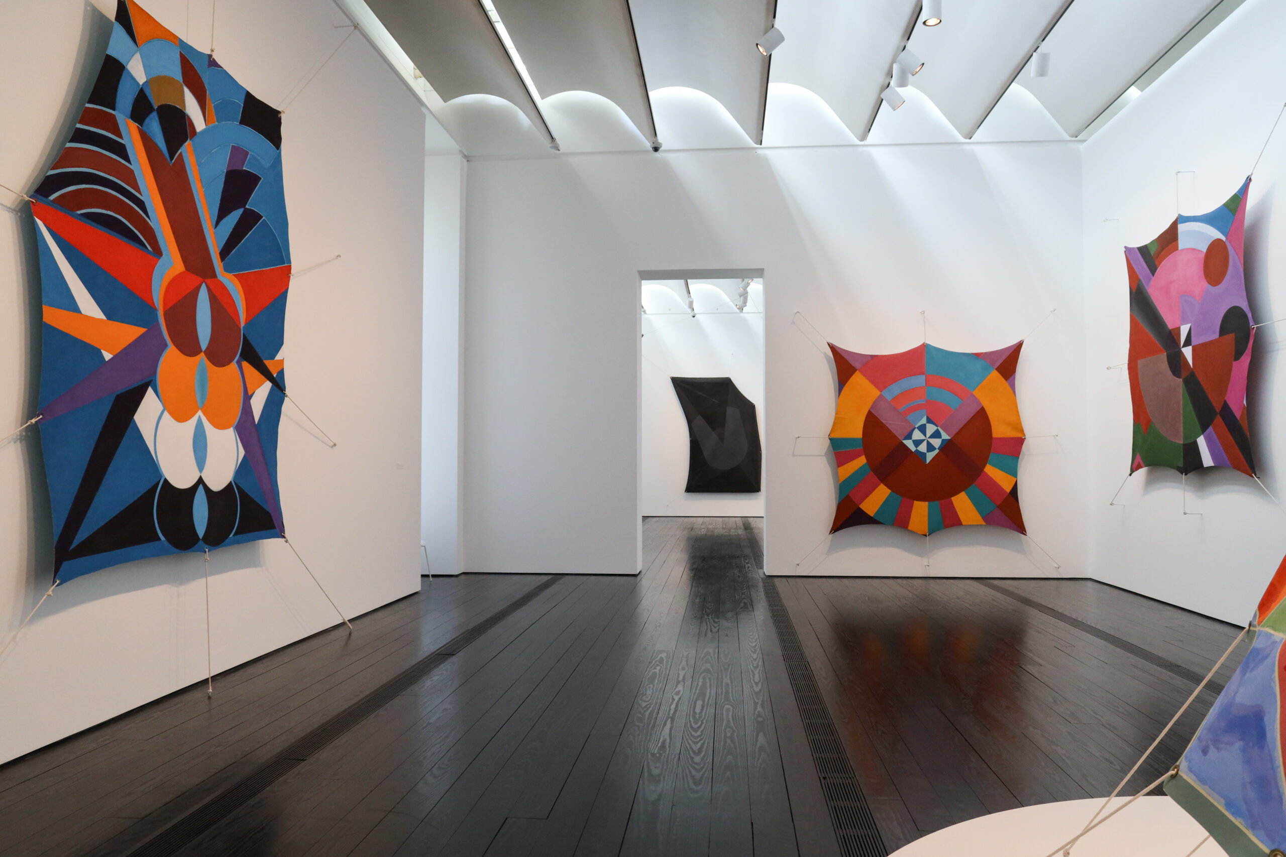Installation view of “Joe Overstreet: Taking Flight,” The Menil Collection, Houston, Texas (Jan. 24-July 13, 2025). Shown at left, “Great Mother of All,” 1970 (acrylic on canvas with metal grommets and cotton rope, 115 × 195 × 65 inches / 292.1 × 495.3 × 165.1 cm), Dimensions variable. | Courtesy The Menil Collection, Houston