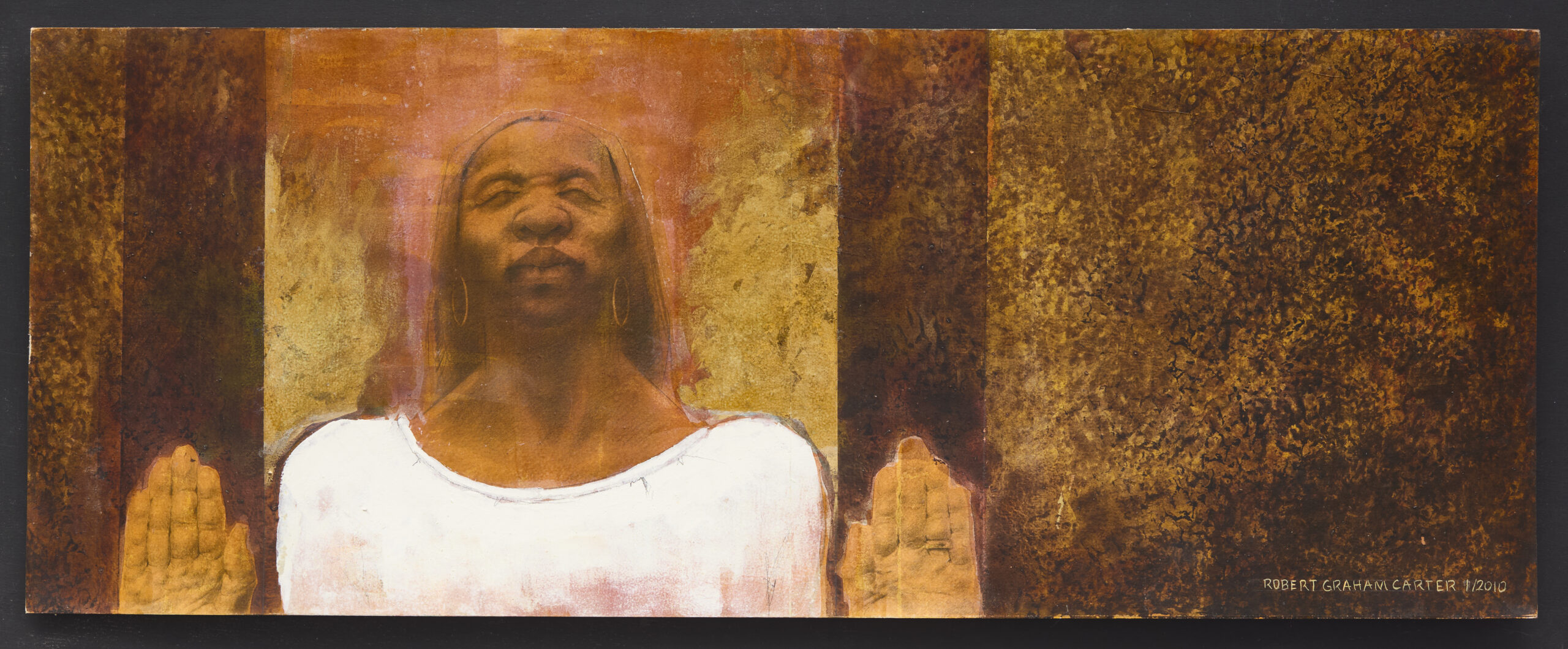 ROBERT CARTER, “If Der Be Angels Den Some Mus Look Like Me (hands raised),” 2010 (acrylic, pencil, and paper mounted on wood panel, 18 1/2 x 48 inches / 47 x 121.9 cm). | © Robert Carter, Courtesy ACA Galleries, NY