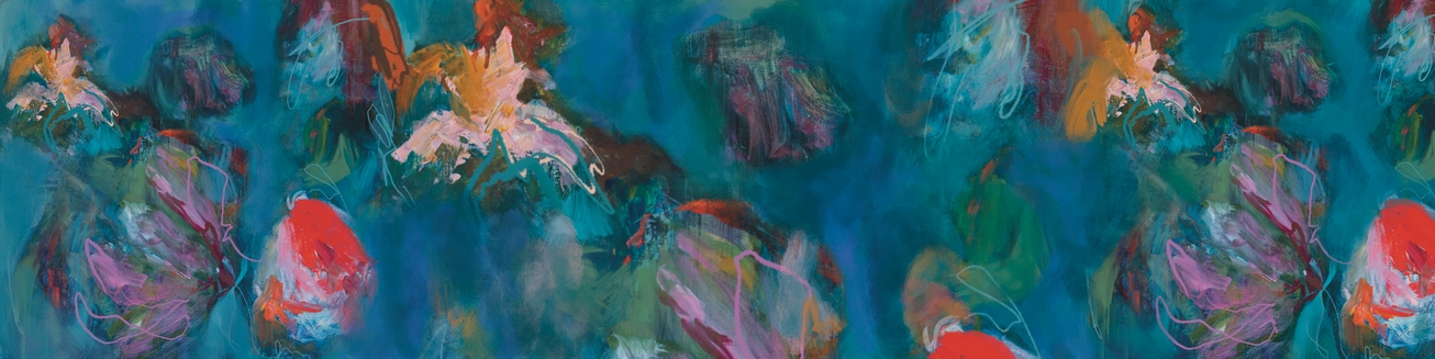 THE AWE-INSPIRING poetry of Langston Hughes informed a floral abstract painting with a rich and varied blue background by Lindsay Adams (b. 1990). “Weary Blues” shares the title of the Harlem poet’s iconic 1925 work. The poem speaks of the transformative power of blues music.