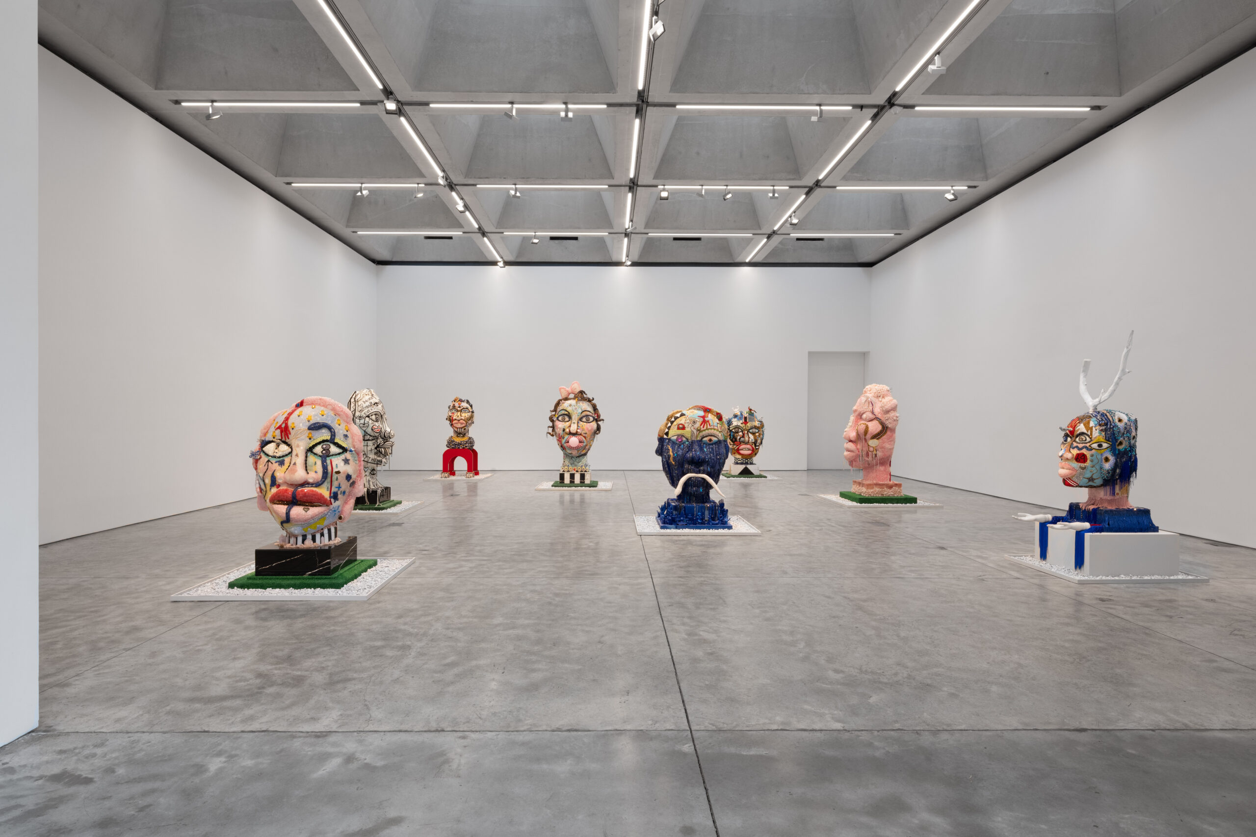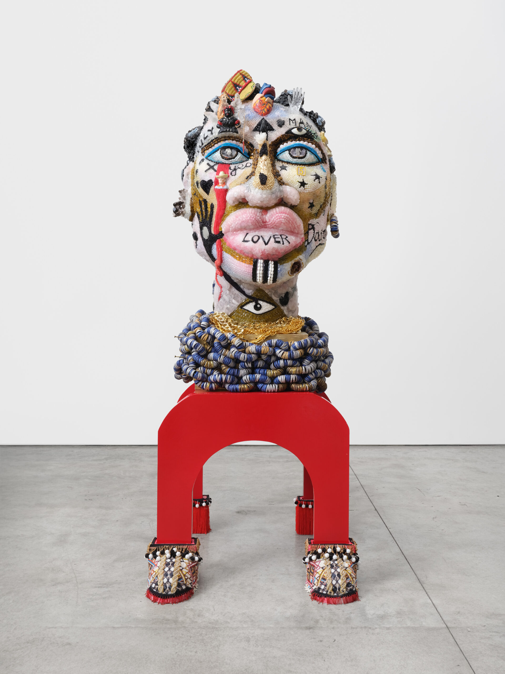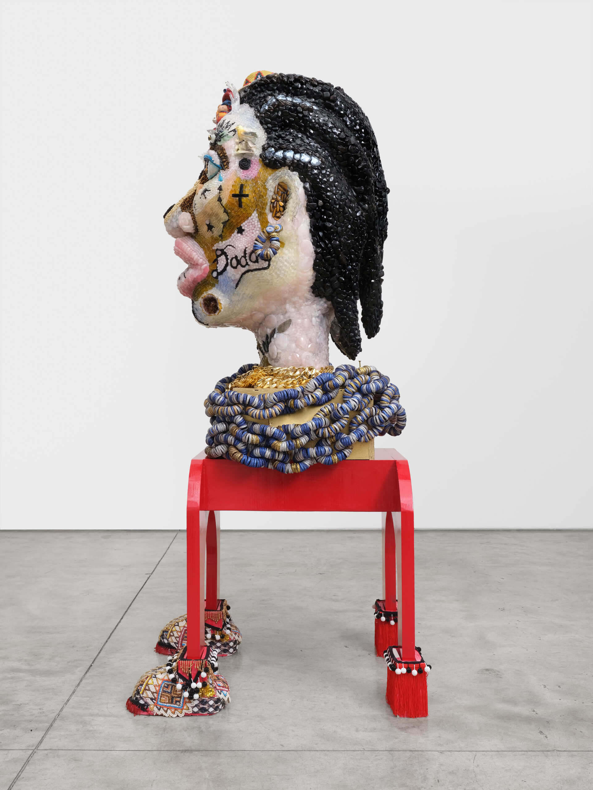 THE LATEST EXHIBITION of vanessa german (b. 1976) presented two new mixed-media sculpture series across two locations at Kasmin gallery in New York. Titled “GUMBALL—there is absolutely no space between body and soul,” the show featured monumental heads inspired by the colossal-sized stone Olmec heads of ancient Mesoamerica and fallen figures that reference the highly skilled dip or “death drop” move performed by vogue dancers in the ballroom culture originated by queer communities in Harlem. The sculptures are fascinating and joyful, odd and mystical.