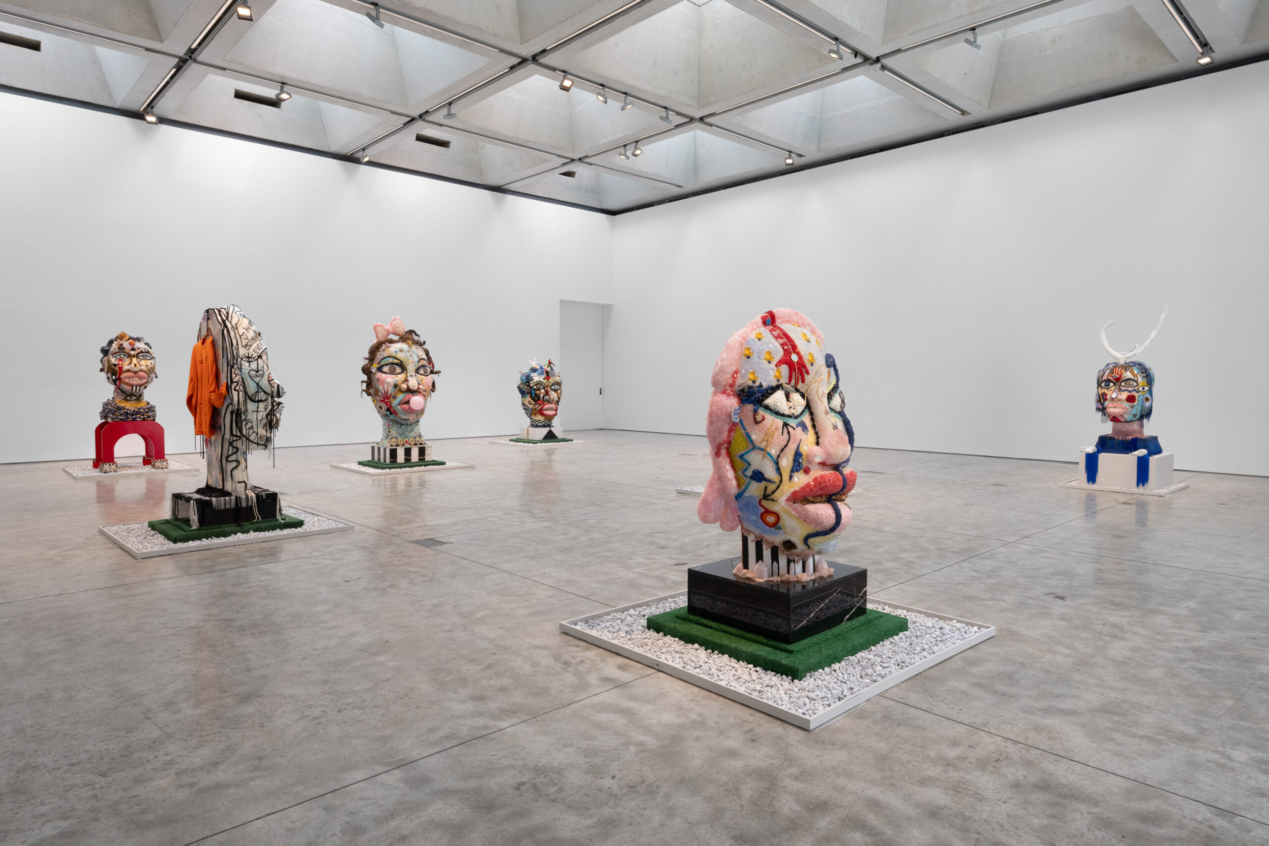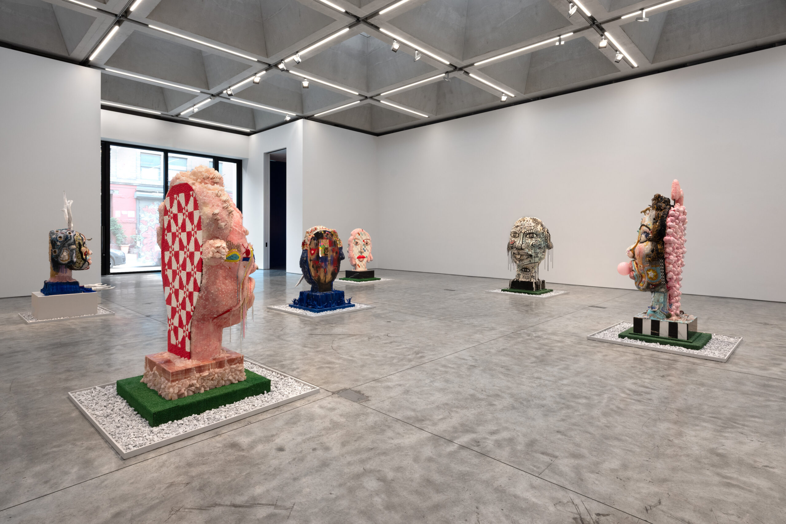 Eight figurative works and nine heads were on view in the exhibition, including the title work “GUMBO” (2025), which is composed of materials such as plaster, gemstones, minerals, cut glass crystal, fish key chains, hand-blown glass gumball, pink prayer beads, wood, and Astroturf. In addition to tangible items, german also specifies the transcendental elements employed in the production of her sculptures. For “GUMBALL,” these more ephemeral materials include “a love song to the Soul of it all,” “a house in which to grow wise in a manner with allows no violation to the being,” “prayers of grace, “the intimacy of loneliness giving into the knowing of deep and true wholeness,” “joyous angelic presence,” and “the levity of the Buddha—HA HA.” CT
