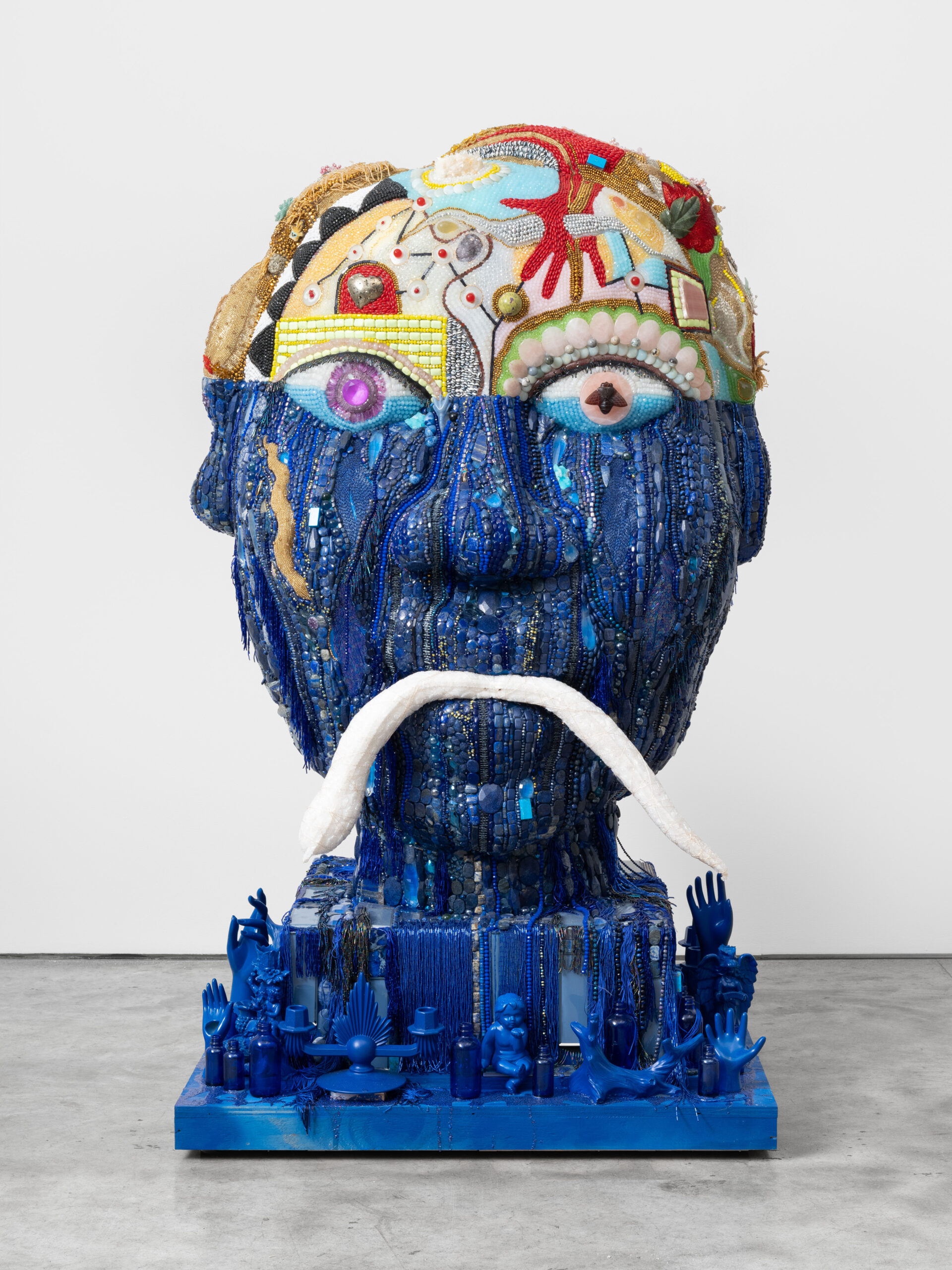 VANESSA GERMAN, “the emergence, or, on considering the transformative nature of the dragon fly as told by Richard Rudd., 2025 (we dance here don’t we bend out our bones and loose our spirts free in an agreement of birth and suffering, wood, plaster, plaster gauze, lapis, sodalite, blue kyanite, quartz, rose quartz, dyed howlite, turquoise, bottles, blue things at the bottom of the sea, languishing, morganite, blue amber eye bee—for seeing the unseen inside of your own self, the deep grief of it all, the light from the wound, blue pigments, a white snake for transformation, a solid fearlessness, grace, onyx, obsidian, rhinestones, cut glass, a host of possibilities, magic and loving that keeps making itself new, over and over again, 64 x 40 x 38 inches / 162.6 x 101.6 x 96.5 cm). | © vanessa german. Courtesy the artist and Kasmin, New York