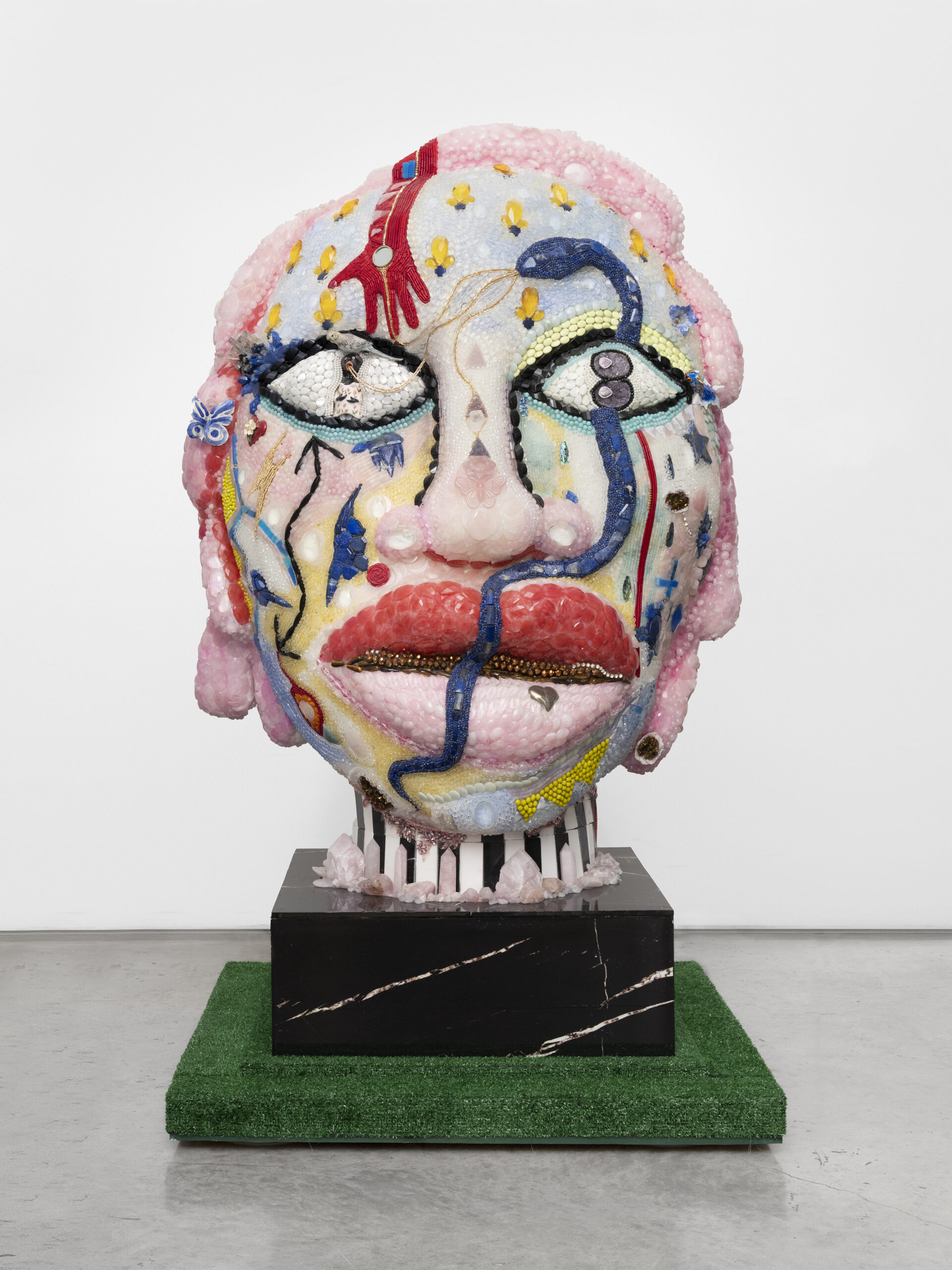 VANESSA GERMAN, “George—at the precipice of the fall,” 2025 (George Washington doll head, the sound of remorse coming up from out of the ground, the end of nostalgia as political mandate, wood, plaster, plaster gauze, rhinestone appliqués, jewelry pieces, gemstone owl, beaded glass trim, a found racist horror of two black faces emerging from over-large ceramic feet, the joy of dancing and knowing that you are free and alive and whole, spray paint, heat and the feeling of hatred, the becoming medicine of the soul, an open imagination, small African mask found in Brooklyn right near the bridge, this game is still very challenging isn’t it, the obviousness of this old grief, how it is to run away from yourself and never get caught, a dancing queen, a penis where one wants a gun, the clearest shape of freedom is being loosed open at this very moment and this artwork is but a glimpse into a new doorway, 31 x 15 3/4 x 12 inches / 78.7 x 40 x 30.5 cm). | © vanessa german. Courtesy the artist and Kasmin, New York