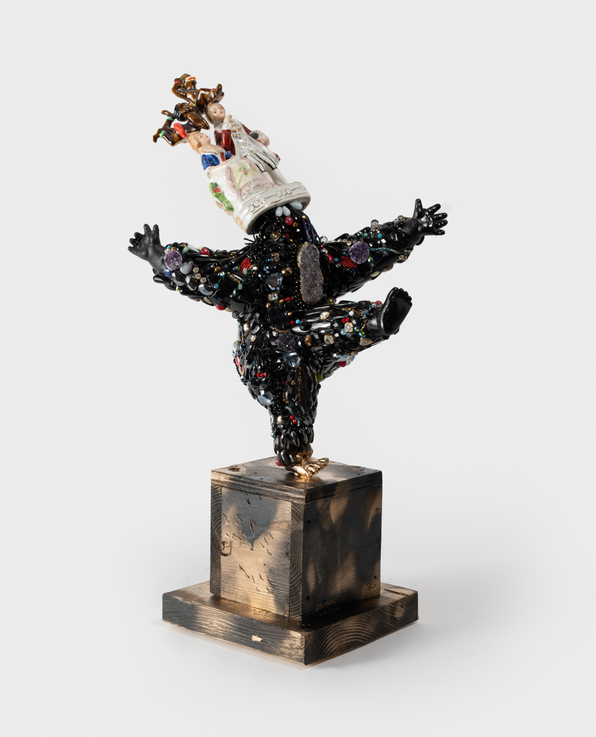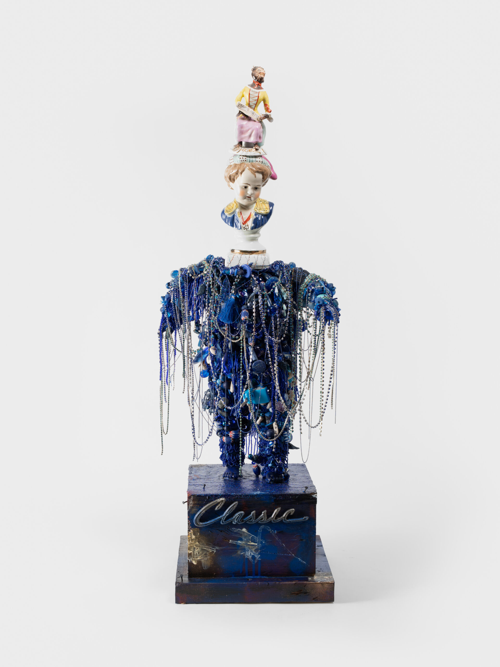 and grease, engine and exhaust. She is giving combustion and relief. She is given rhinestone and chain. She is giving gold-filled. She is given precious little dainty ceramic baby and monkey band dupe. She is giving fragility. She is giving the miseries of luxury at doll scale. She is grounded in her sacral chakra. She has no need to spaceship to mars. She bites and offers prescriptive accountability in the divine nature of mutuality as a threshold of understanding. She is lapis, glass beaded trim and sodalite, she is sapphire and aragonite. She is spray paint and intentional damage to the aesthetic narrative of perfection as luminous existence, titanium coated quartz, doll parts, the blues and the drip of it, the tension of greed and how not even greed can stave off death, might as well fly, 37 1/2 x 11 1/2 x 11 inches / 95.3 x 29.2 x 27.9 cm). | © vanessa german. Courtesy the artist and Kasmin, New York
