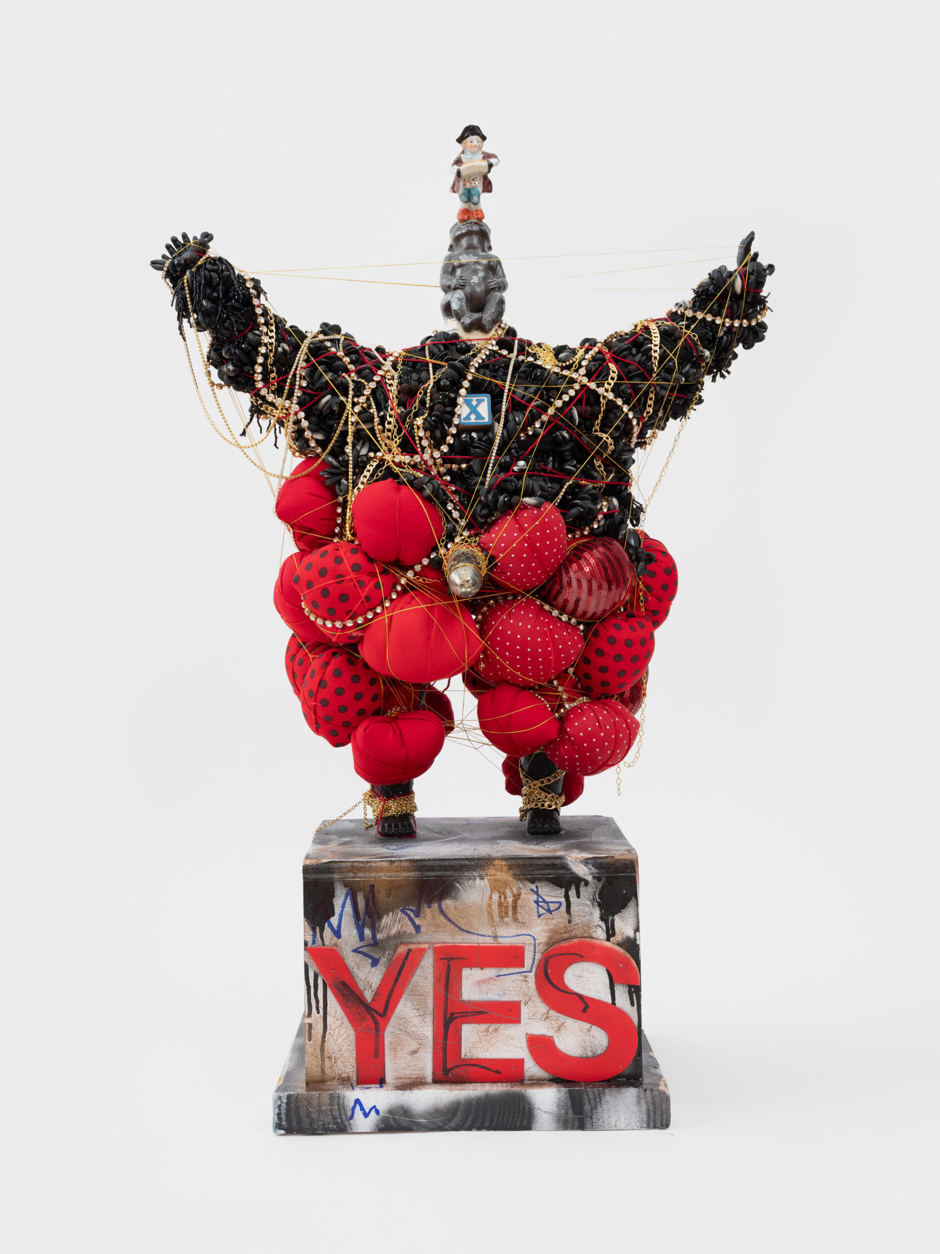 VANESSA GERMAN, “sweet love, or THE HUNGER OF IT ALL IS EATING ME UP, or, ACIM lesson #28 and #31, respectively: Above all else, I want to see things differently. I am not a victim of the world I see.,” 2025 (a wondrous muse of light, wood, doll parts, cloth, twine, how it feels to be swallowed whole and then to come out the other end wet and brand new, the spice of life, wire, beads, beaded glass trim, spray paint, strange pot metal black figure with a mouth open wide in a wail or an attempt to swallow the universe, porcelain figurine being swallowed whole, the tension of the having or not having or being had, the way that n it even greed can thwart death, pyrite phallus, chain, rhinestone, the blackness, 37 1/2 x 24 x 14 1/8 inches / 95.3 x 61 x 35.9 cm). © vanessa german. Courtesy the artist and Kasmin, New York
