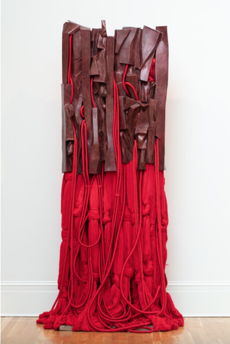 BARBARA CHASE-RIBOUD, “Malcolm X #16,” 2016 (bronze with red patina, silk, wool, polished cotton and synthetic fibers with steel support, 233.7 x 81.3 x 76.2 cm / 92 x 32 x 30 inches). | © Barbara Chase-Riboud. Photo: Lucia Momoh/Jeffrey Johnston