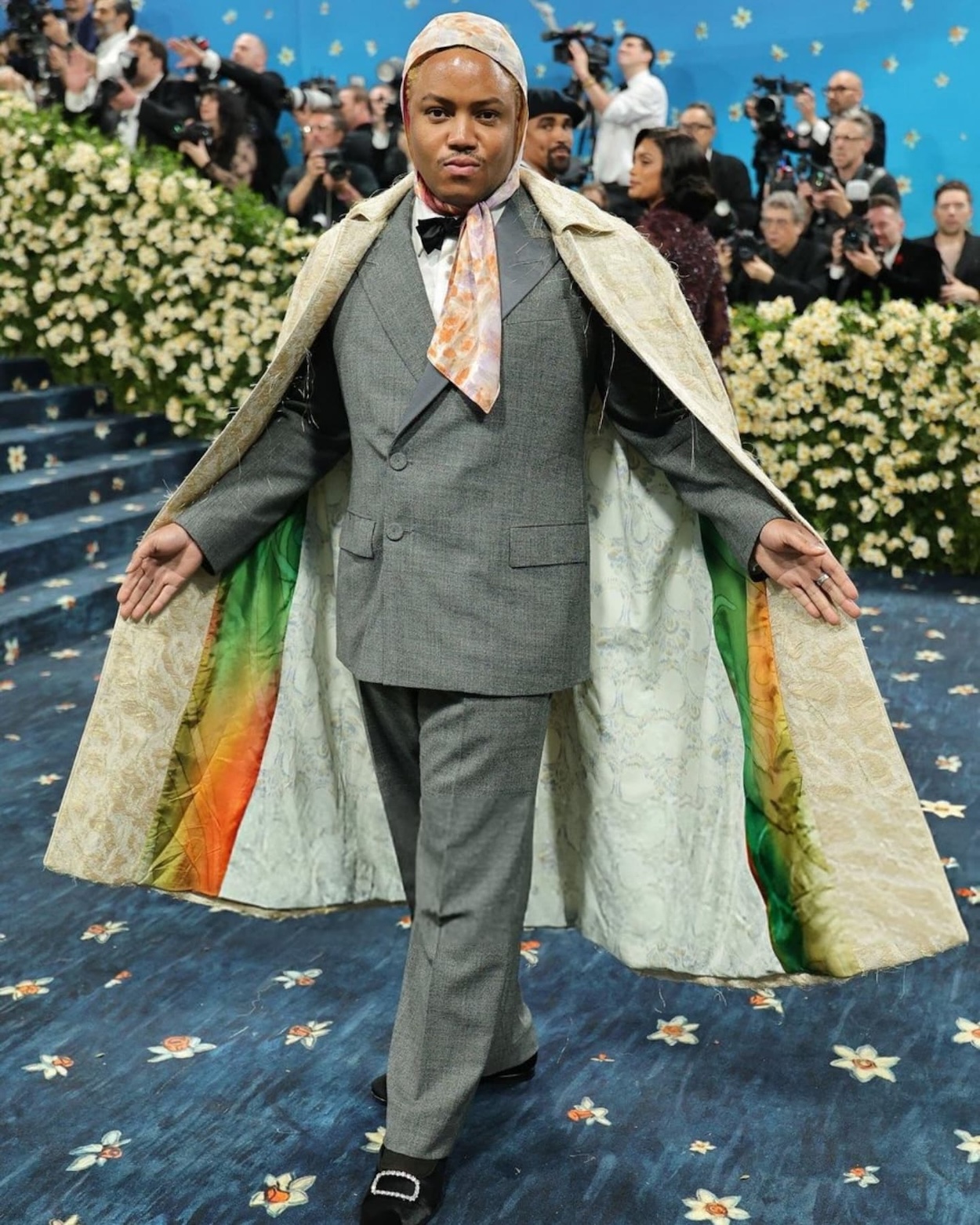 ARTIST ERIC N. MACK IN WALES BONNER. | The work of Eric N. Mack is a nexus of fashion, textiles, painting, and space. He invests in the meaning, identity, and history embedded in fabrics. On Instagram, he wrote about the details of his Met Gala ensemble made in collaboration with Wales Bonner. The opera coat was lined with fabric from Mack’s collection of scarves and he wore silk head scarf of his own making in homage to André Leon Talley. “Eric N. Mack: All the Oohs and Aahs,” a solo exhibition of the artist, opens at the Wexner Center for the Arts at the Ohio State University in Columbus on Aug. 23, 2025. | Photo: Dia Dipasupil/Getty Images