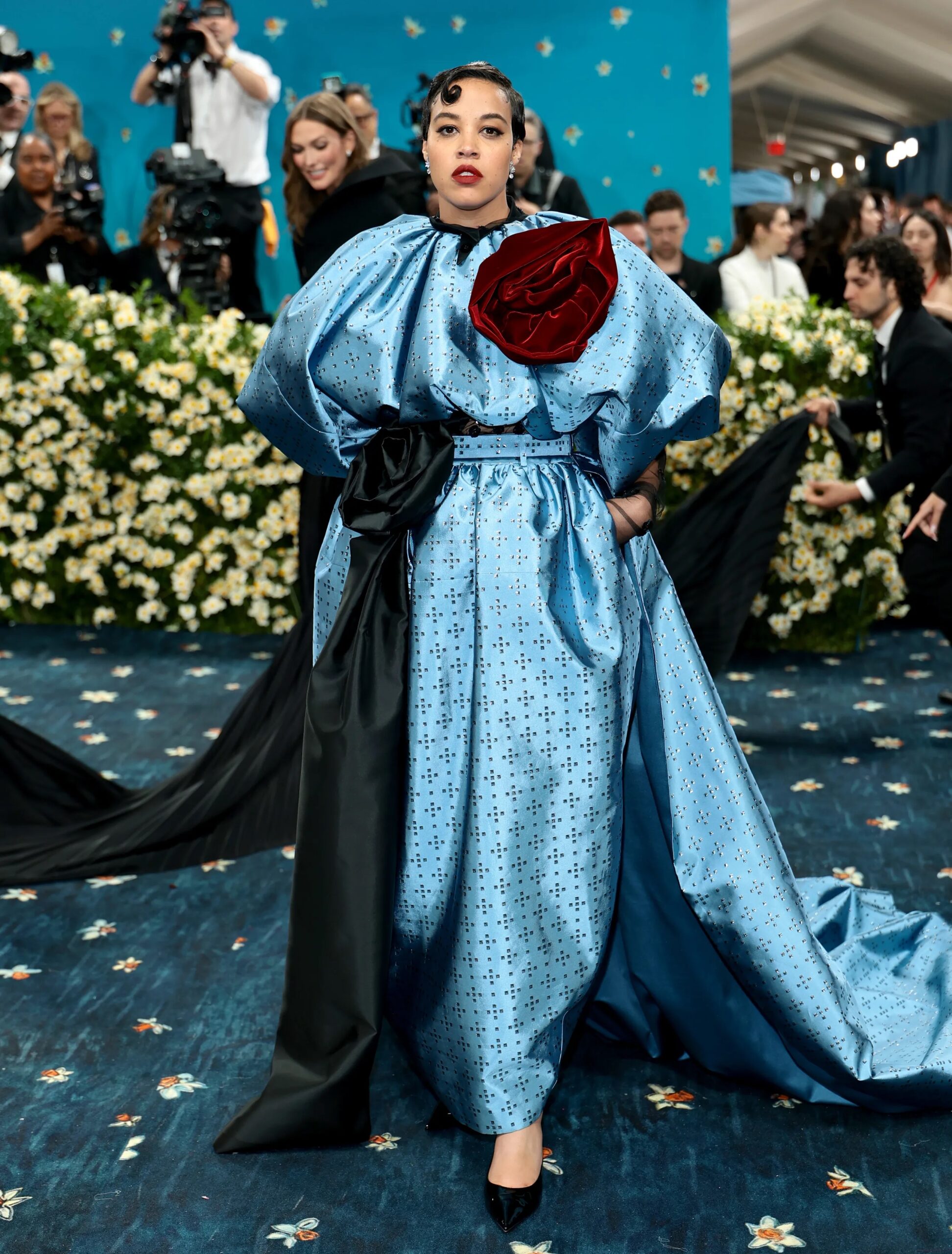 Inside the gala, Gavin’s painting was projected onto the ceiling of the Met Museum’s Temple of Dendur and inspired a central installation—a shower of blooms cascading above a bed of white flowers. On the blue carpet, the flowers are meant to be read as stars dotting the night sky.