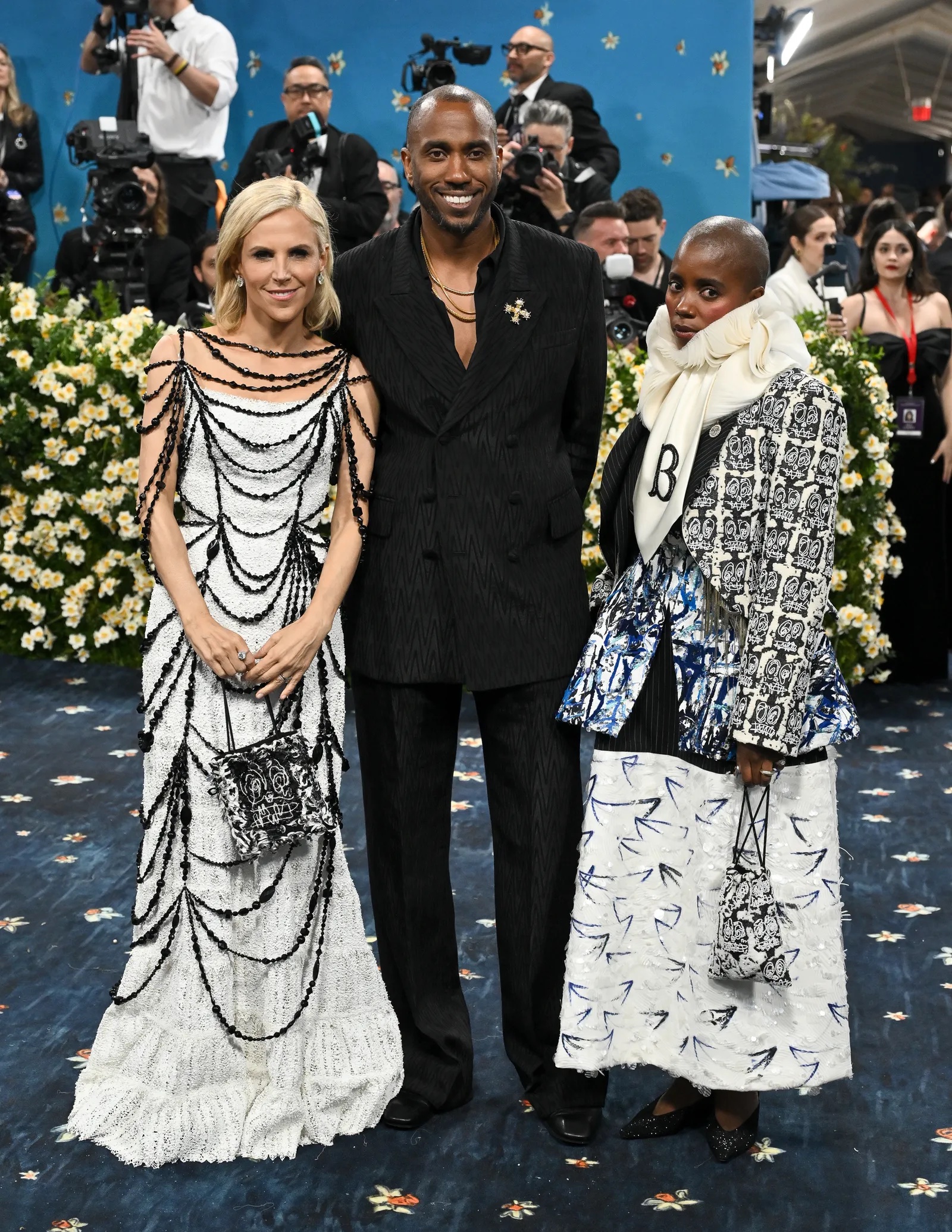 ARTISTS RASHID JOHNSON & SHAREE HOVSEPIAN IN TORY BURCH. | Rashid Johnson was a member of the Met Gala host committee. Johnson and his wife, Sharee Hovsepian, are friends with designer Tory Burch, with whom he collaborated on a Met Gala look for filmmaker Janicza Bravo. “Rashid Johnson: A Poem for Deep Thinkers,” a 30-year retrospective of the artist is on view at the Guggenheim Museum in New York, through Jan. 18, 2026. | Photo: Jamie McCarthy/Getty Images
