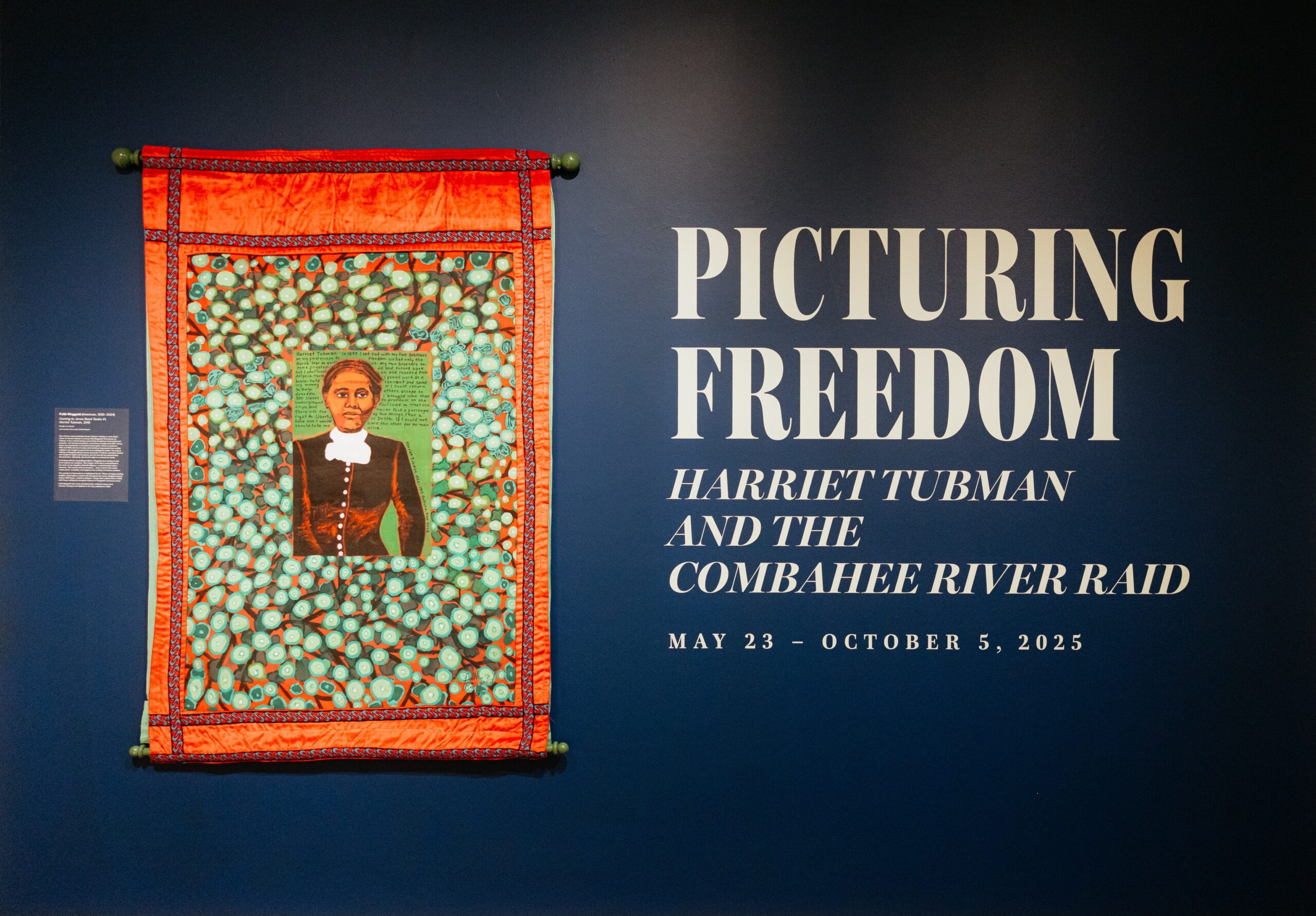Installation view of “Picturing Freedom: Harriet Tubman and the Combahee River Raid,” Gibbes Museum of Art, Charleston, S.C. (May 23-Oct. 5, 2025). Shown, FAITH RINGGOLD, “Coming to Jones Road Tanka #1, Harriet Tubman,” 2010 (acrylic on canvas). | Loan Courtesy Estate of Faith Ringgold. Photo by Thomas Photographers, Courtesy Gibbes Museum of Art