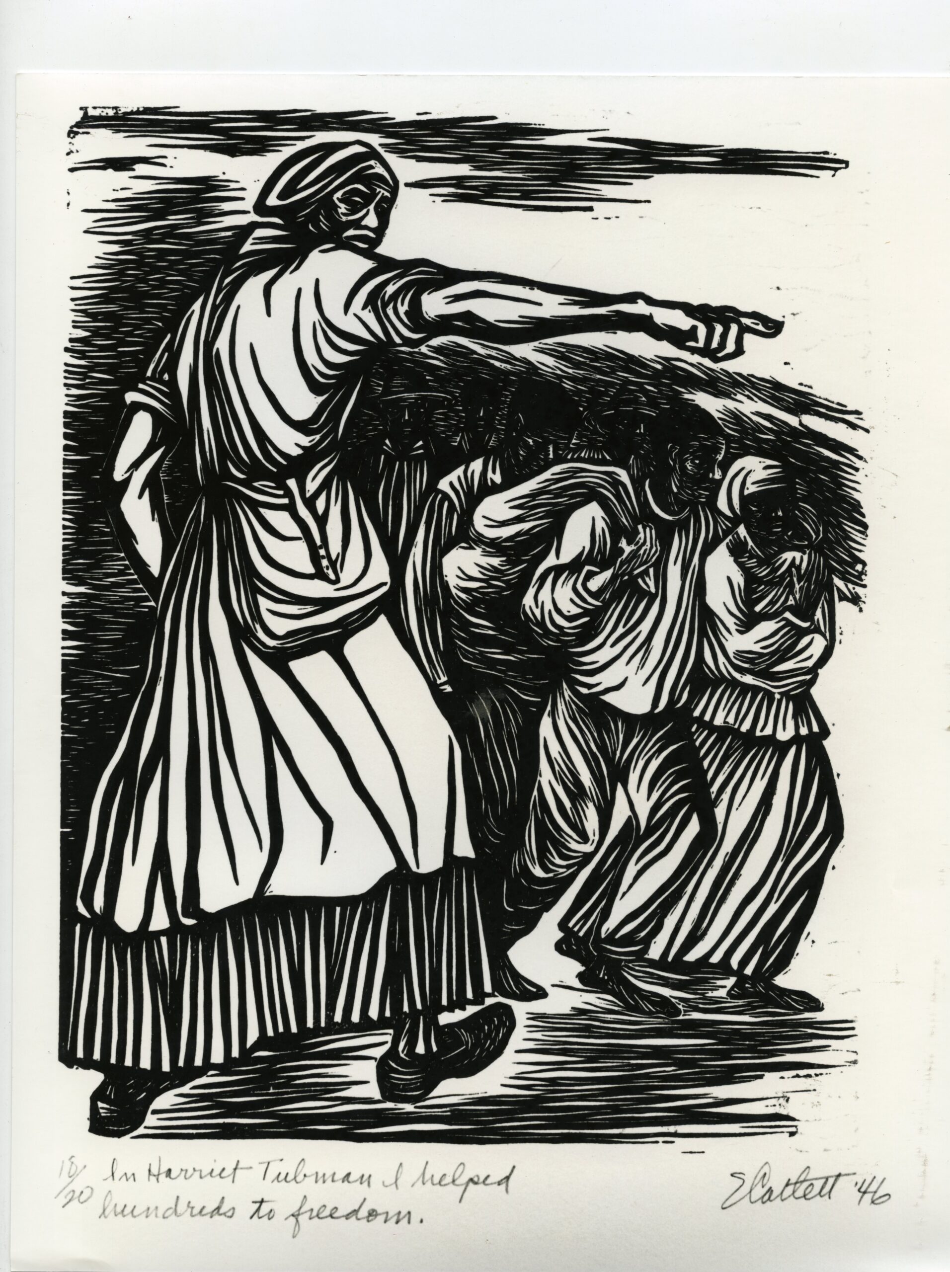 ELIZABETH CATLETT, “In Harriet Tubman I Helped Hundreds to Freedom,” 1946, reprinted in 1989 (linocut, 18/20). | Collection of the Hampton University Museum, Hampton, VA. © 2025 Mora-Catlett Family. Licensed by VAGA at Artists Rights Society (ARS), NY