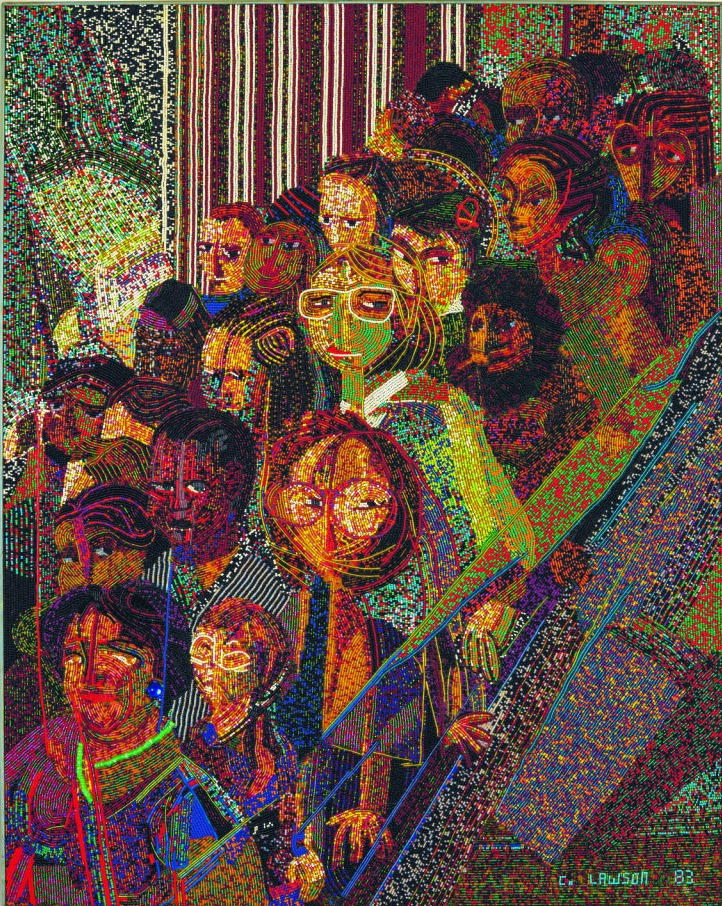 CLEM LAWSON, “Angoisse sur l’escalator,” 1983 (glass beads on wood, 92 × 73 cm). | Collection Philippe Lawson. © Clem Lawson, 1983. Représenté par Philippe Lawson, Avocat Photo © Centre Pompidou/Bertrand Prévost