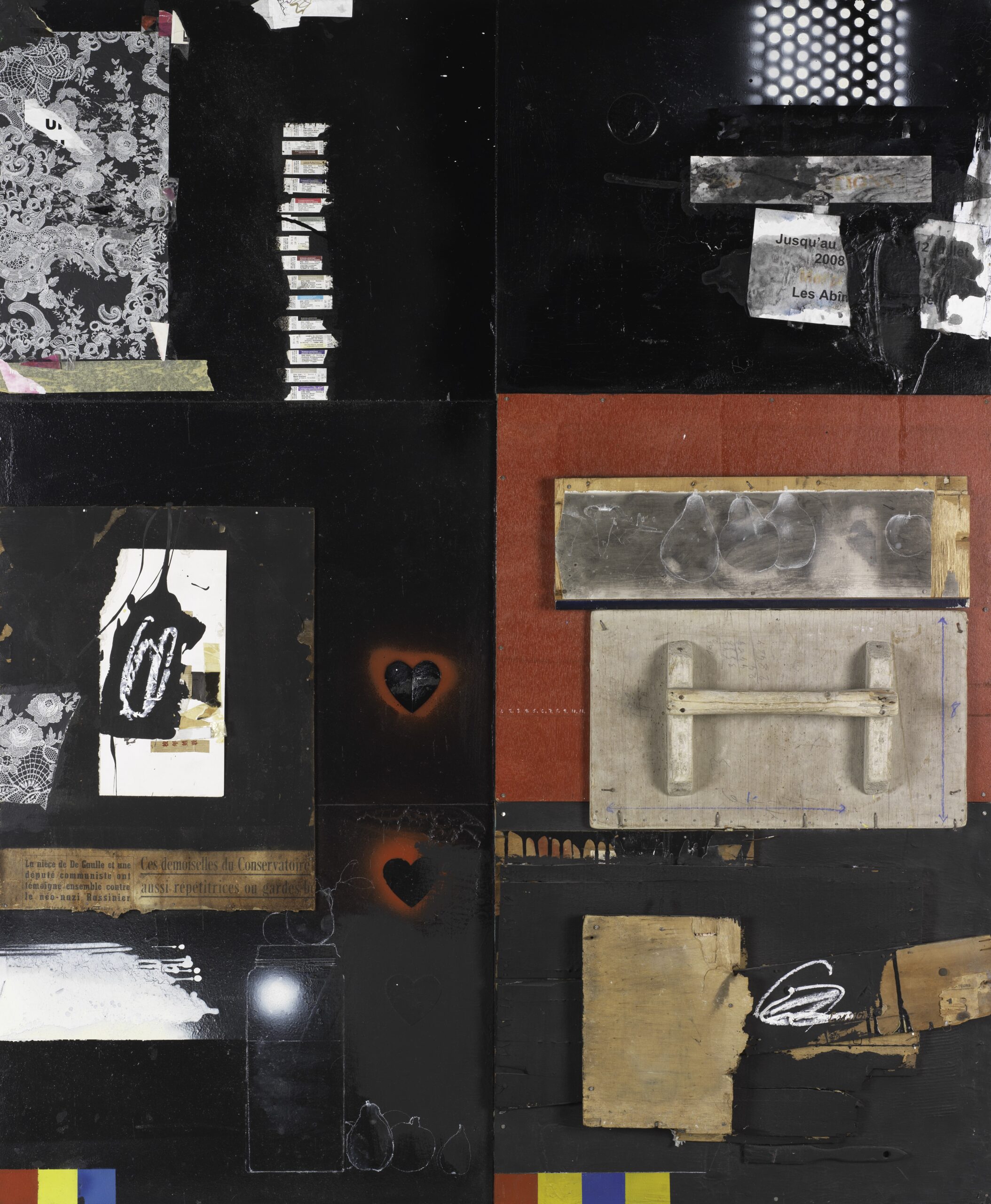 RAYMOND SAUNDERS, “Asking for Colors, Marie’s Gift [Demander des couleurs, cadeau de Marie],” circa 2000 (wood, torn papers, tape, paint and chalk on panel, 148 × 122 cm). | Centre Pompidou, Musée national d’art moderne, Paris. Don des Amis du Centre Pompidou, 2024. AM 2024-895. © The Estate of Raymond Saunders. All rights reserved. Photo © Centre Pompidou, MNAM-CCI/Joseph Banderet/Dist. GrandPalaisRMN