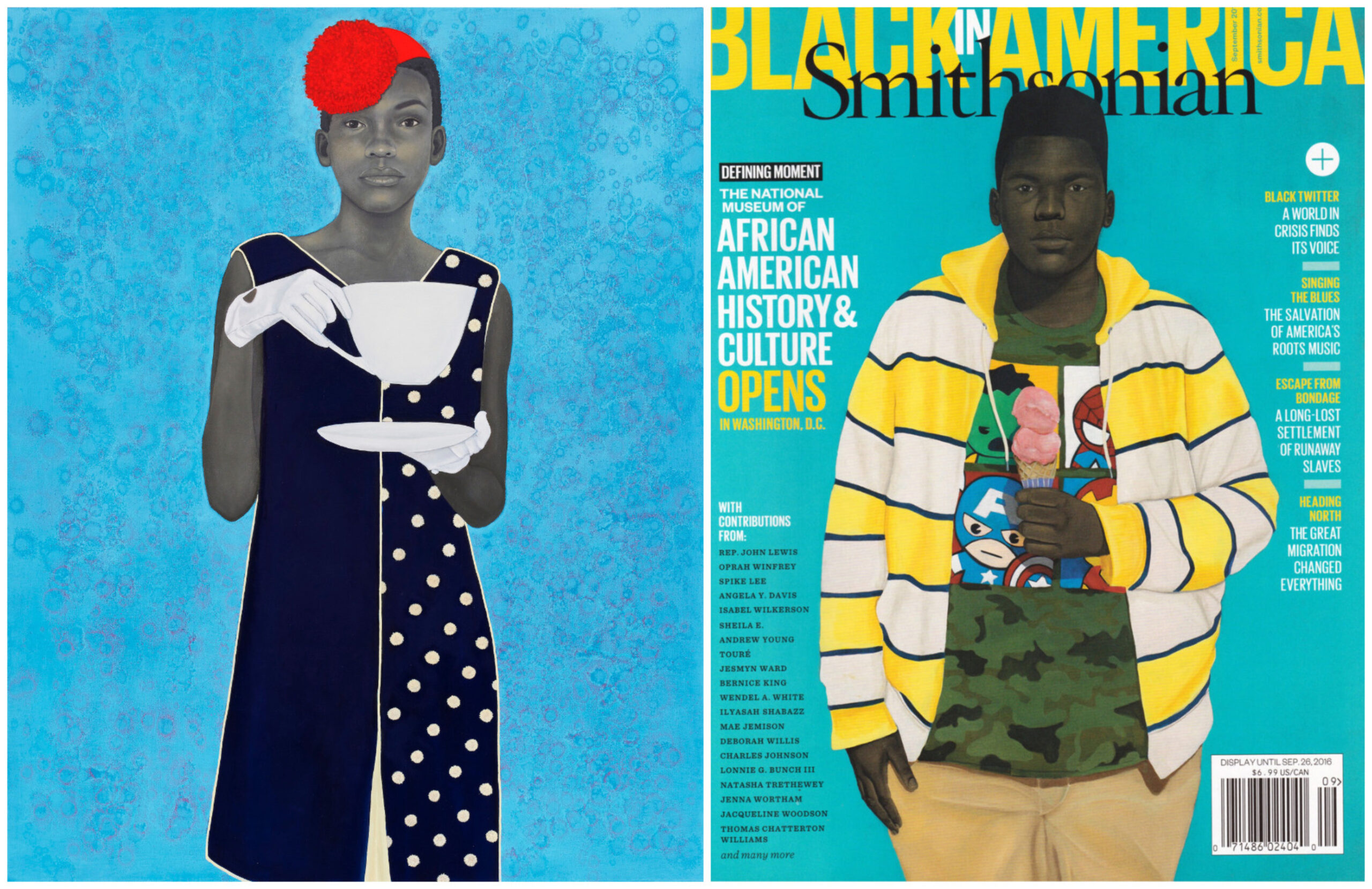 From left, 2016 Outwin Boochever Portrait Competition Winner: AMY SHERALD,” Miss Everything (Unsuppressed Deliverance),” 2014 (oil on canvas, 54 × 43 × 2 1/2 inches /137.16 × 109.22 × 6.35 cm). | Private Collection. © Amy Sherald. Courtesy the artist and Hauser & Wirth. Photograph by Joseph Hyde; “Innocent You, Innocent Me” (2016) by Amy Sherald appeared on the cover of the September 2016 issue of Smithsonian magazine in celebration of the opening the National Museum of African American History and Culture