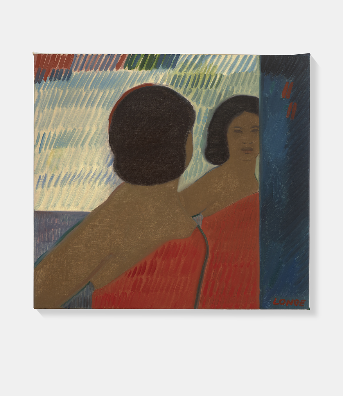 NEW FIGURATIVE PAINTINGS by British artist Sahara Longe capture real and imagined scenes, based on dreams, personal memories, and reflections on family. School girls wearing blue uniforms are caught whispering. A woman in a red dress glimpses her reflection as she passes a mirror. In another picture, a man and woman are arranged at some distance from one another, compositionally prioritizing the relationship among fields of rich color over any indication of how the figures may be connected.