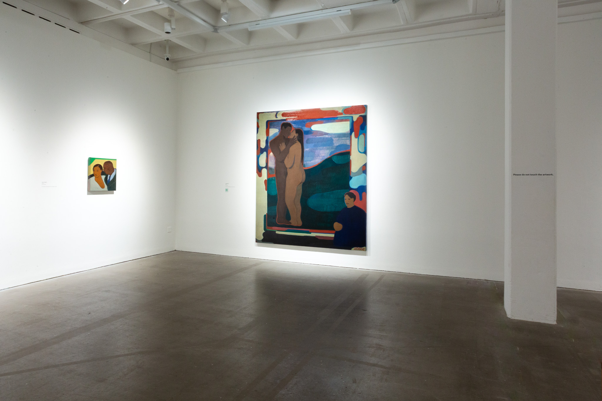 One of the more sizable paintings on display, “The Yellow Dress” (2025), sheds light on the title of the exhibition. A woman wearing a form-fitting mustard yellow dress gives a wanting glance back over her shoulder as she ascends stairs on the left side of a painting, while a couple facing one another, intimately close, appears to float above the ground on the right.