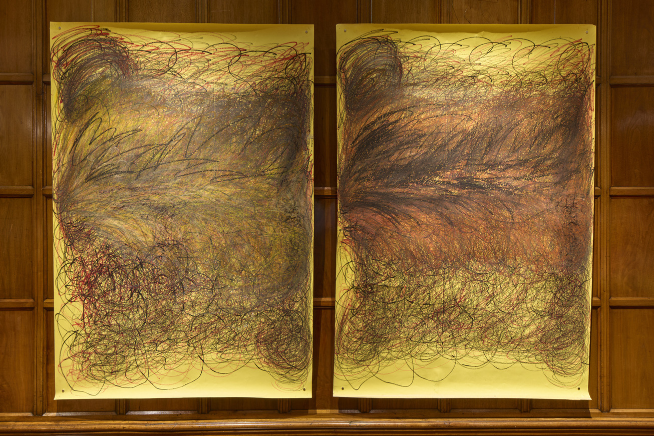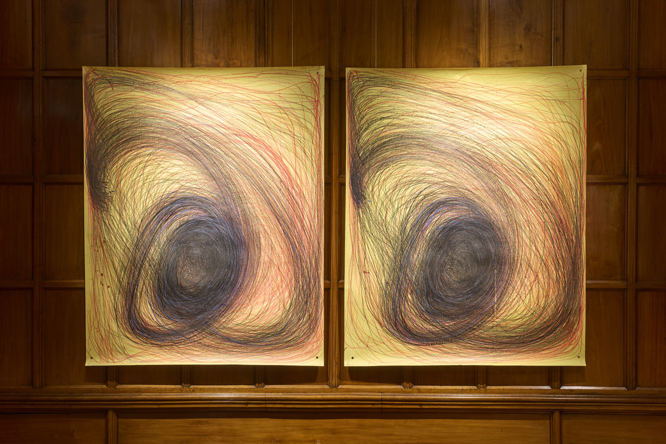 The Turner Prize recognizes, and encourages debate around, new developments in British contemporary art. Kalu’s practice spans sculpture, installation, and two-dimensional works on paper. She makes cocoon-like, hanging sculptures layering and building up her works by persistently wrapping the amorphous shapes and forms with unconventional materials, including masking tape and shiny ribbon from VHS tapes. Her large-scale drawings are infinite swirls that look like spiraling vortexes. Across mediums, the works are defined by her color sense and repetitive and rhythmic gestures.