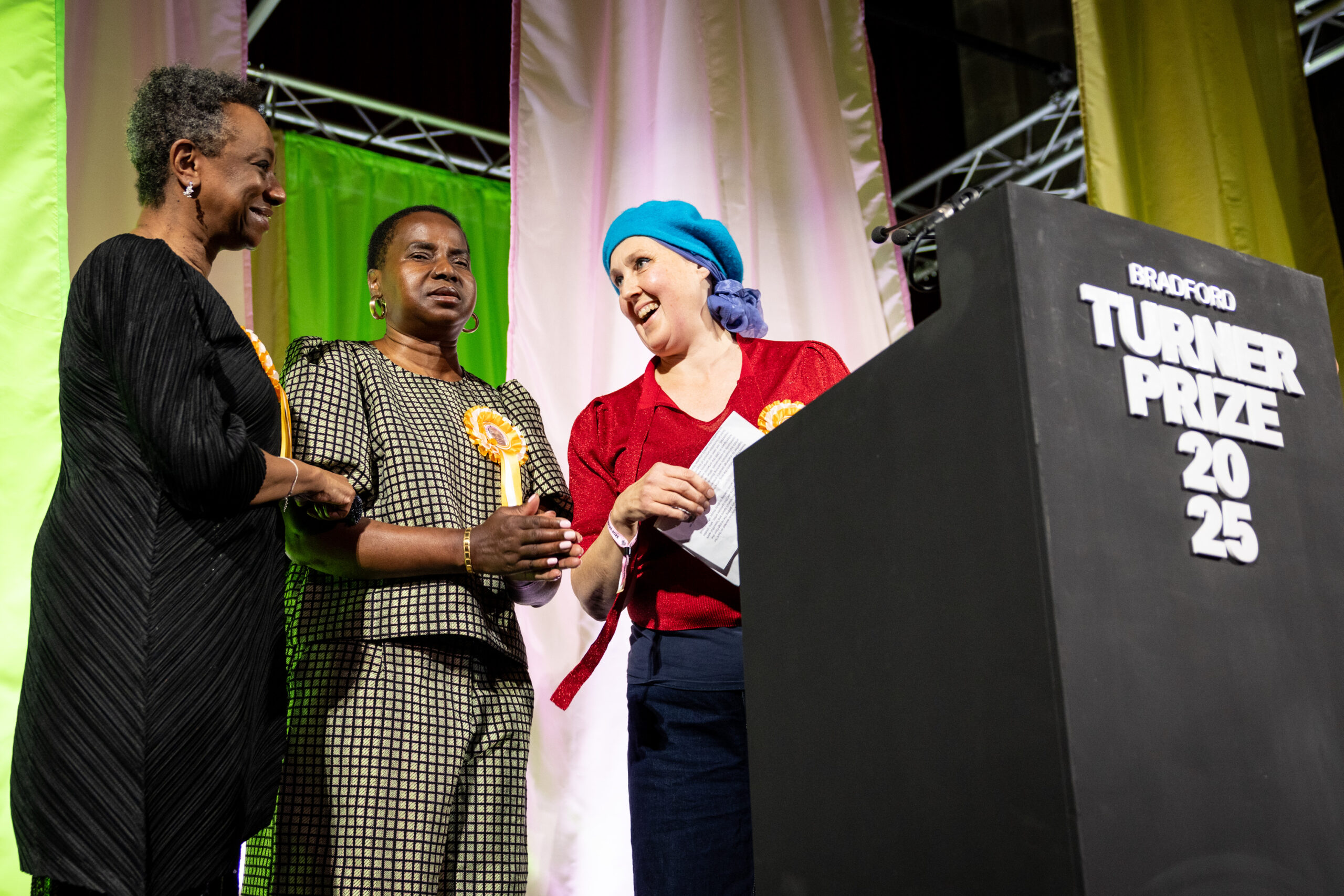 Dec. 9, 2025: Nnena Kalu was announced as the winner of the Turner Prize 2025 by magician Steven Frayne, formerly known as Dynamo, at a ceremony at Bradford Grammar School. This year, the prize was presented as part of Bradford 2025 UK City of Culture. When she accepted the prize, Kalu was flanked by her supporters at ActionSpace. Shown, from left, Sheryll Catto, artistic director and CEO of ActionSpace; artist Nnena Kalu; and Charlotte Hollinshead, head of artist development at ActionSpace. | Photo: James Speakman/PA Media Assignments, Courtesy Tate