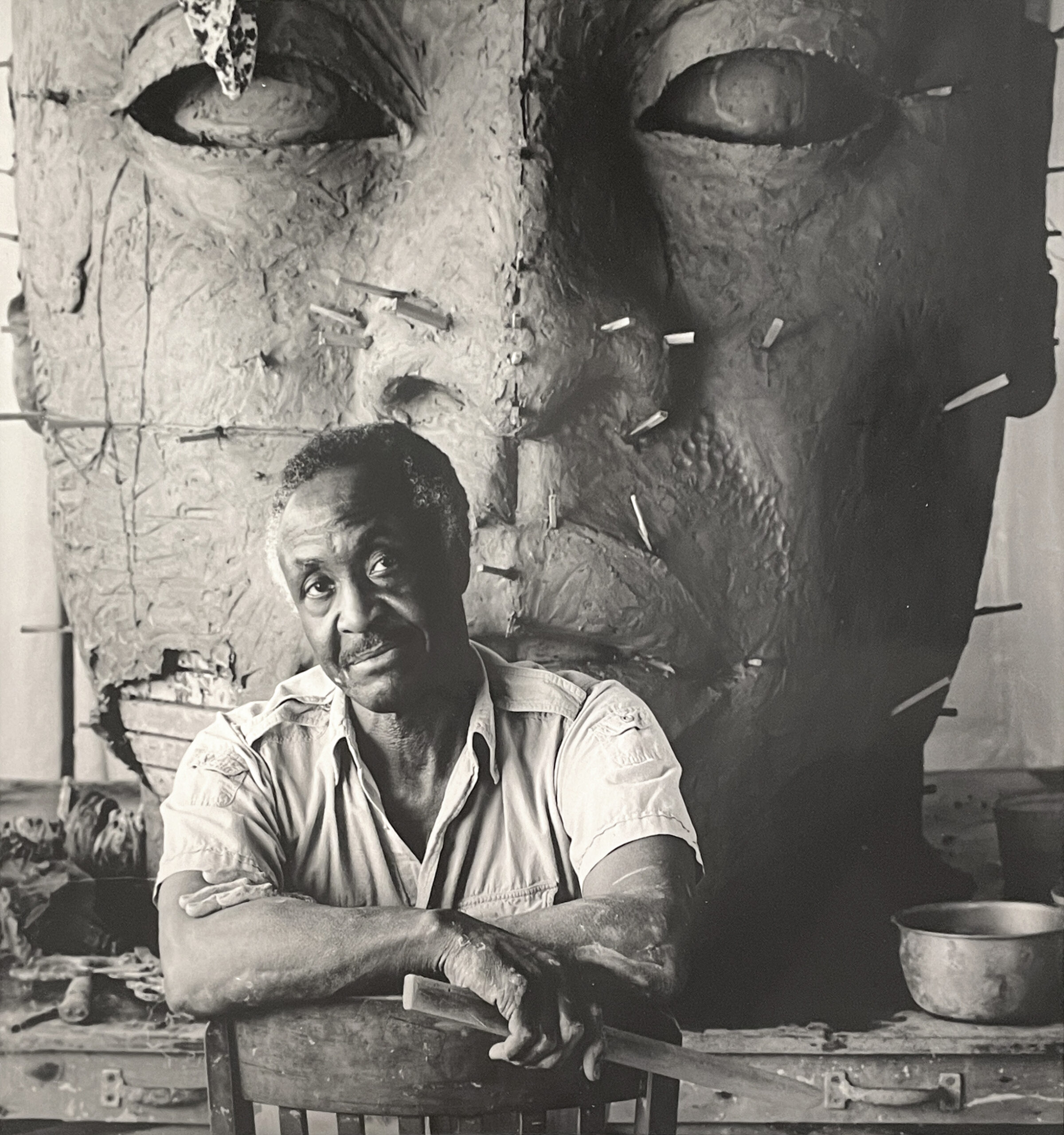 John Wilson with the clay for his monumental 7-foot sculpture, “Eternal Presence” (circa 1986), which was installed in front of the National Center for Afro-American Artists in Roxbury area of Boston, Mass. | Photo: David Schaefer, John Wilson Archive. Photo Courtesy Museum of Fine Arts, Boston
