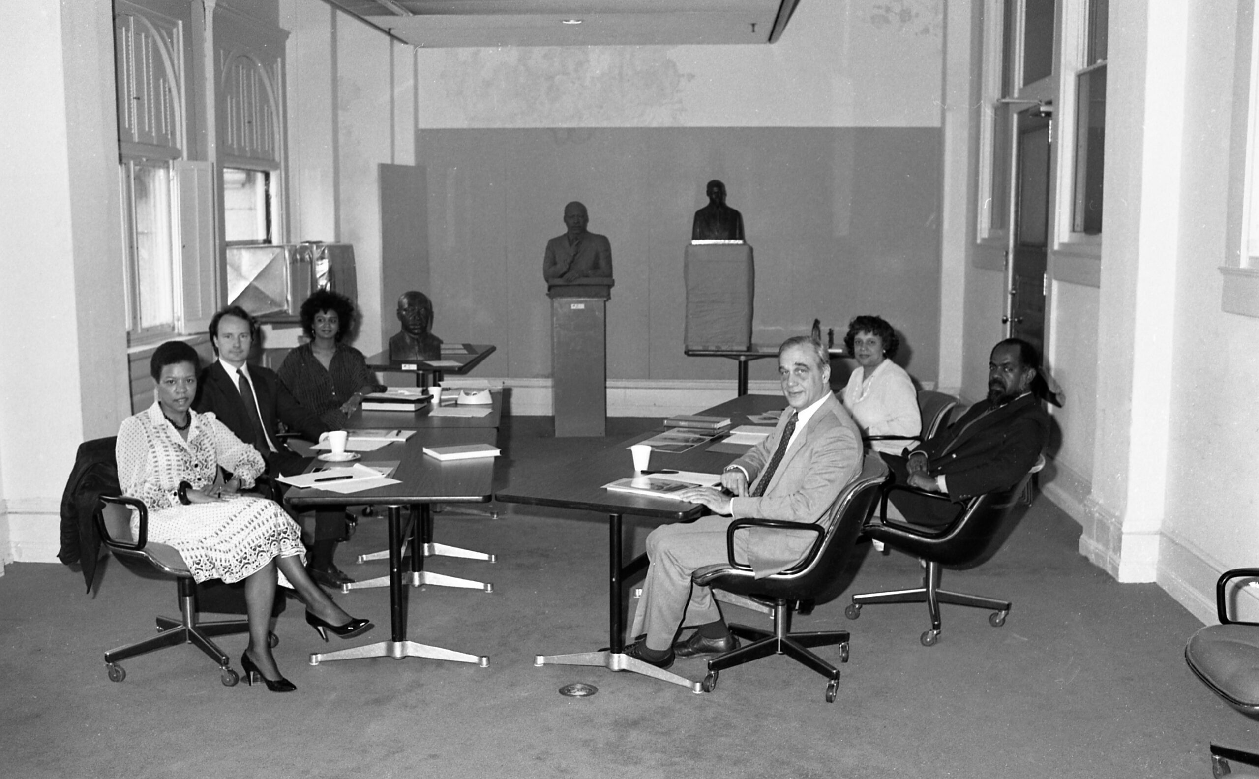 National Endowment for the Arts panel reviewing artist submissions for King bust commissioned by Congress. Shown in background, from left, by Elizabeth Catlett, Zenos Frudakis, and John Wilson. Panel members, clockwise from left, Mary Schmidt Campbell, John Hallmark Neff, Debra Spencer Ryder, E.J. Montgomery, Edmund Barry Gaither, and Thomas Whittlesey Leavitt. (Date on file: April 15, 1985). | © Architect of the Capitol / Steve Payne, Courtesy Architect of the Capitol